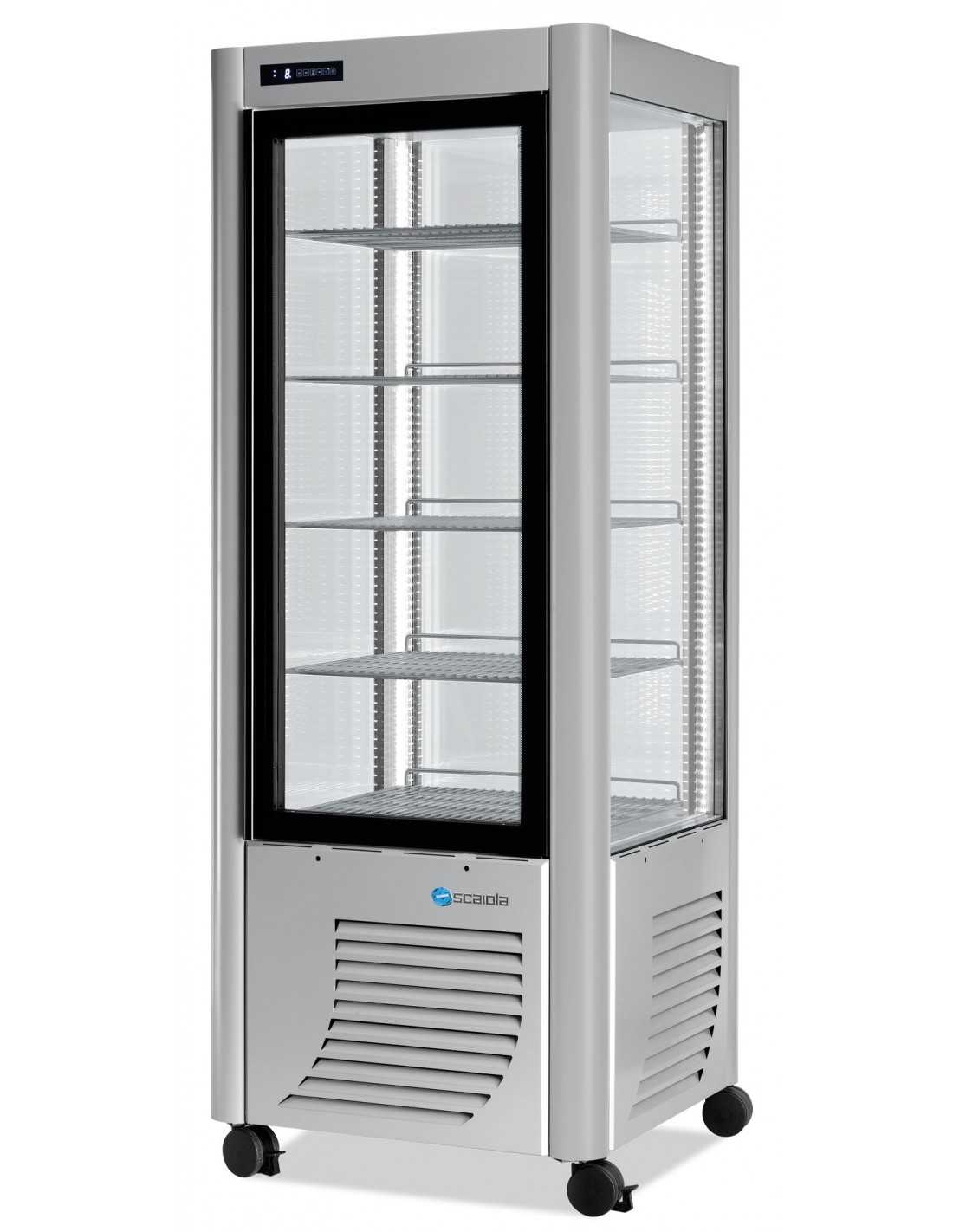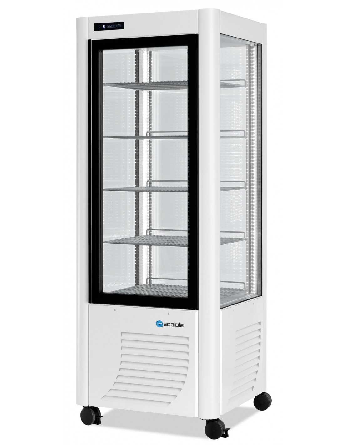 Vitrina refrigerada - Temperatura +2 +10°C - Capacidad Litros 400 - Estantes N° 5 en rejilla - Expositor 4 caras - Refrigeración ventilada - Iluminación LED - Dimensiones cm 70 x 70 x 184 h