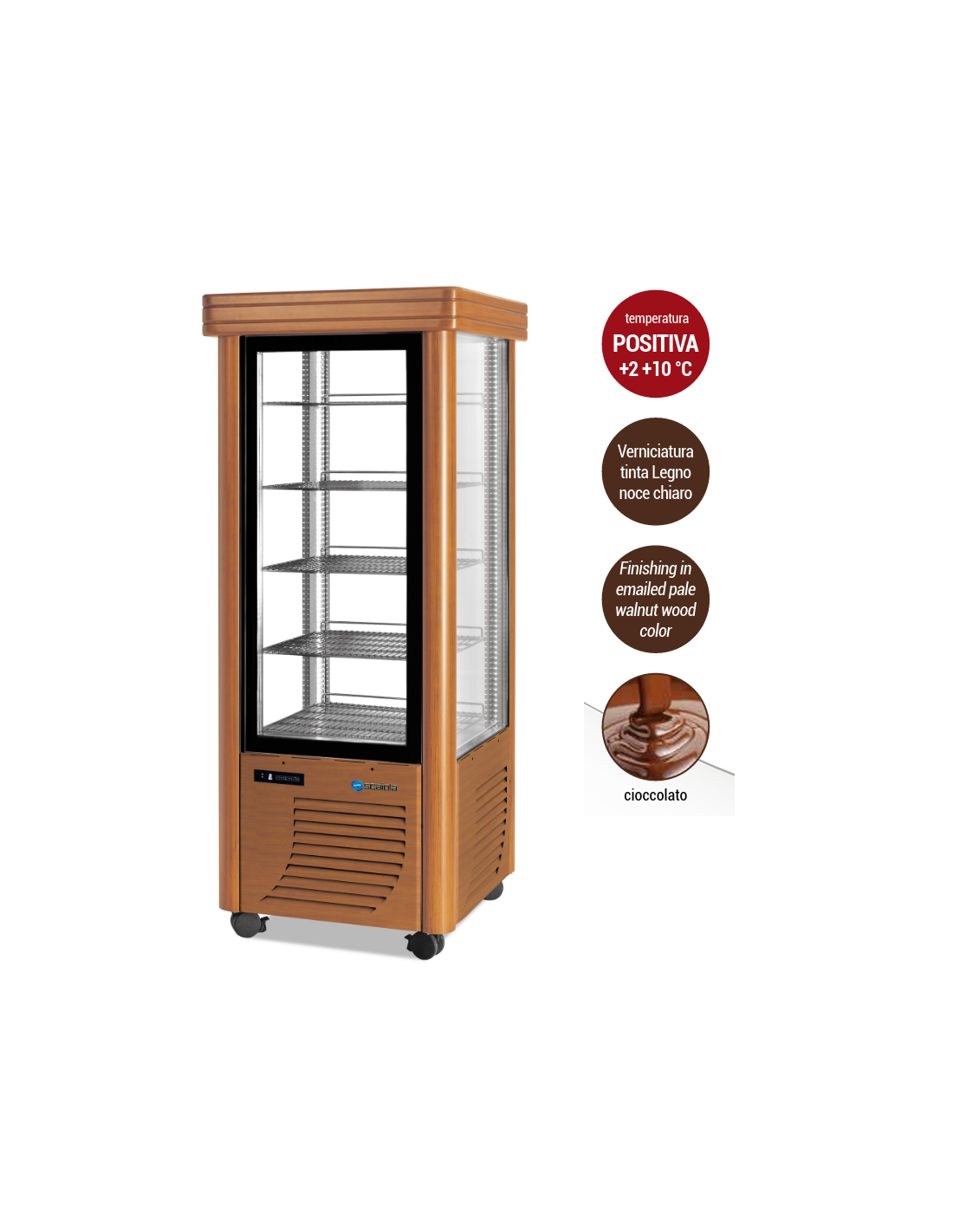 Vitrina de chocolate - Temperatura +14/+18 °C - Capacidad 400 litros - Estantes rectangulares - Exposición a 4 caras - Refrigeración ventilada - Descongelación automática - Iluminación LED - Dimensiones cm 75 x 75 x 186 h