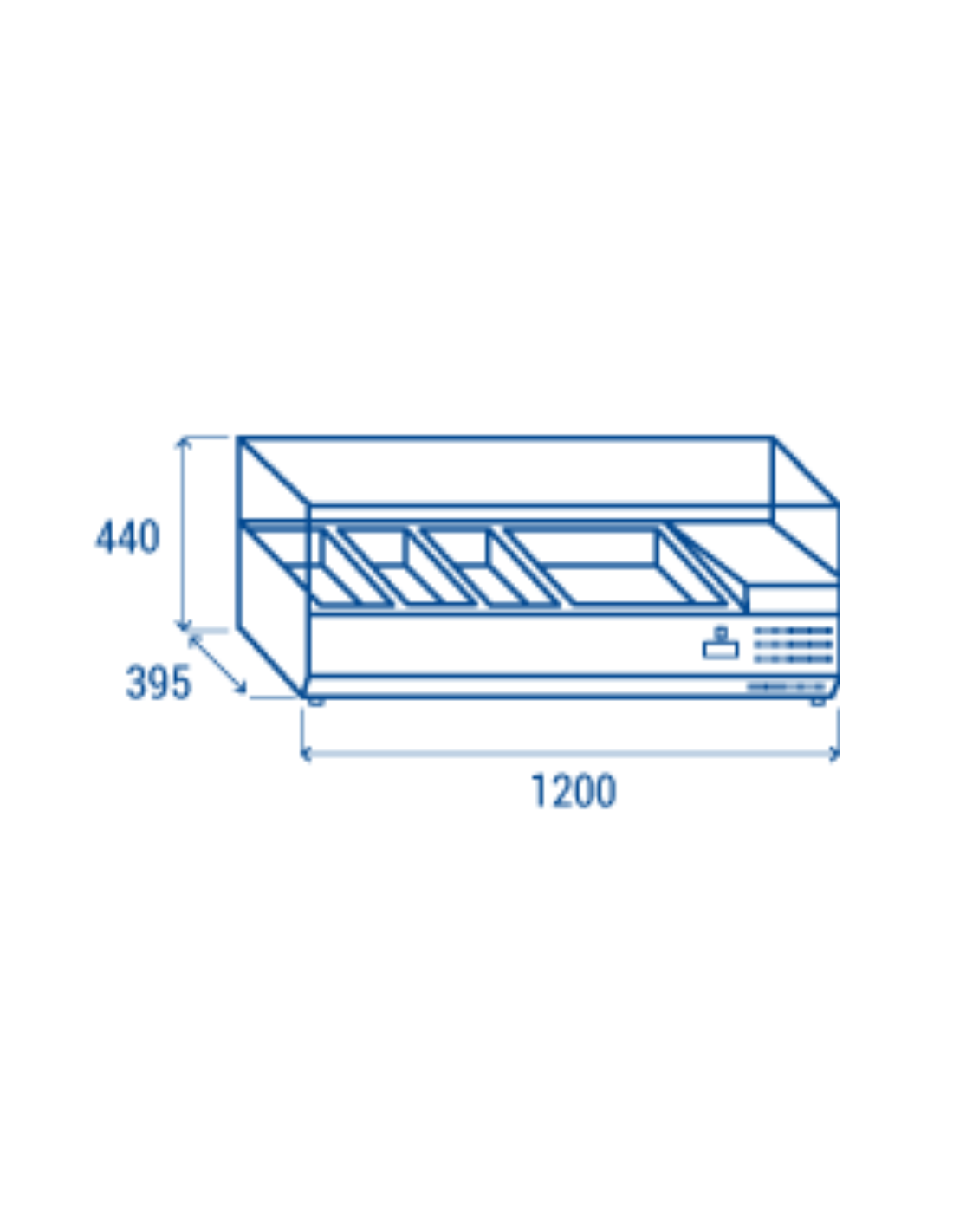 Vitrina de ingredientes - Modelo VRX12/38 - N. 3 bandejas GN1/3 + 1 GN 1/2 - Capacidad 43 L - Temperatura +2° ~ +8°C - Encimera de cristal templado - Refrigeración estática - Dimensiones cm 120x39,5x44 h