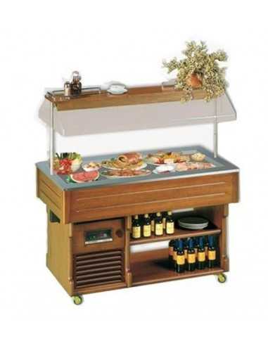 Isla buffet expositora refrigerada - Modelo ISOLARUGIADA4M - Temperatura -1°/ 0°C - Refrigeración estática - Descongelación automática - Estructura de madera - Opcional: configuración Industria 4.0 - Dimensiones cm 142,2 x 75 x 153 h