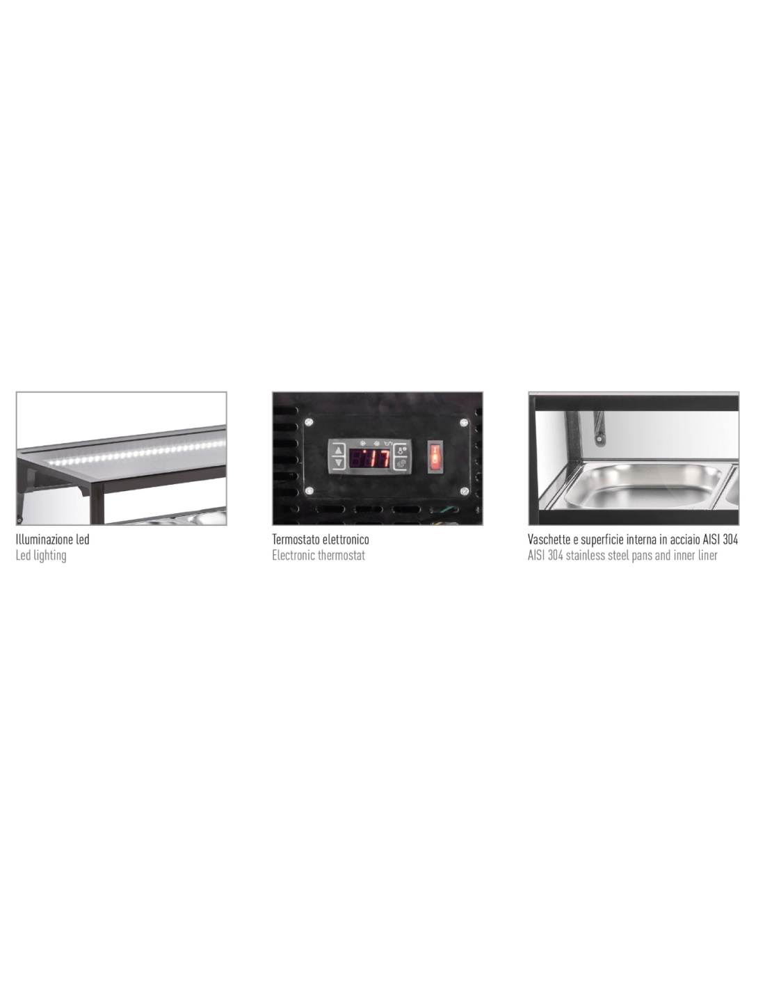 Vitrina refrigerada para sushi - Modelo SUSHI135 Temperatura - 0 +12 °C - Capacidad 5 x GN1/3 - Dimensiones cm 135,3 x 40,6 x 31,8 h