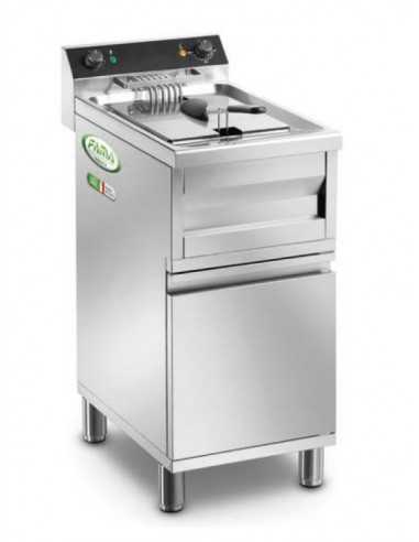 Freidora eléctrica - ModeloSMFR12M - Estructura de chapa de acero inoxidable - Cuba de acero con grifo interior - Capacidad aceite Lt.12 - Energía Kw 9.0 - Alimentación Trifasico - Dimensiones Cm 40 x 70 x 96 h