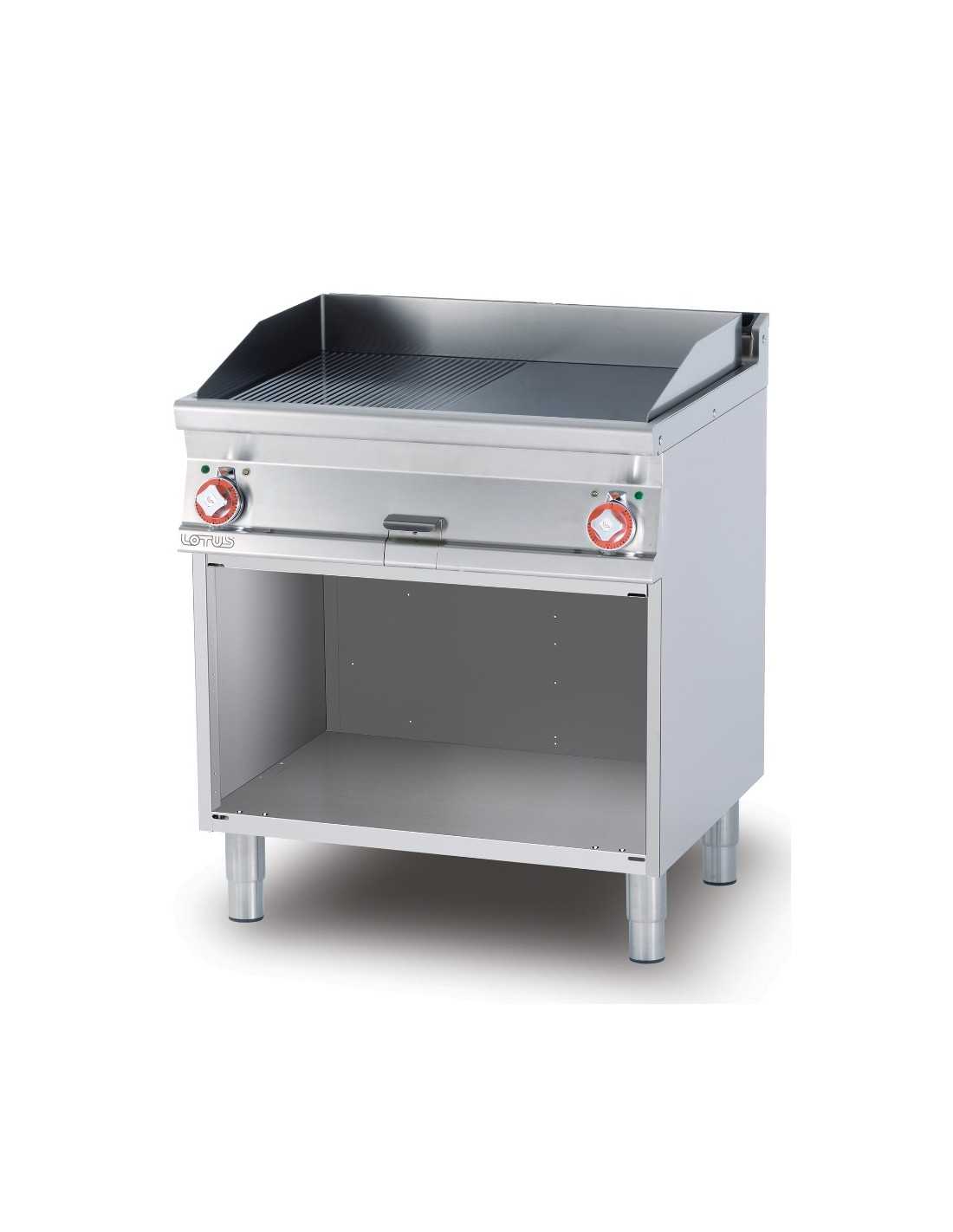 Fry top eléctrico - Modelo FTLR-78ETS - Placa 1/2 lisa 1/2 estriada - Placa cromada supercroma (homologada moka) - Dimensiones placa cm 76 x 51 - N. 2 zonas de cocción - Compartimento abierto - Energía kW 11,1 - Energía trifásica V400-50/60Hz - Dimensiones cm 80 x 70,5 x 90 h
