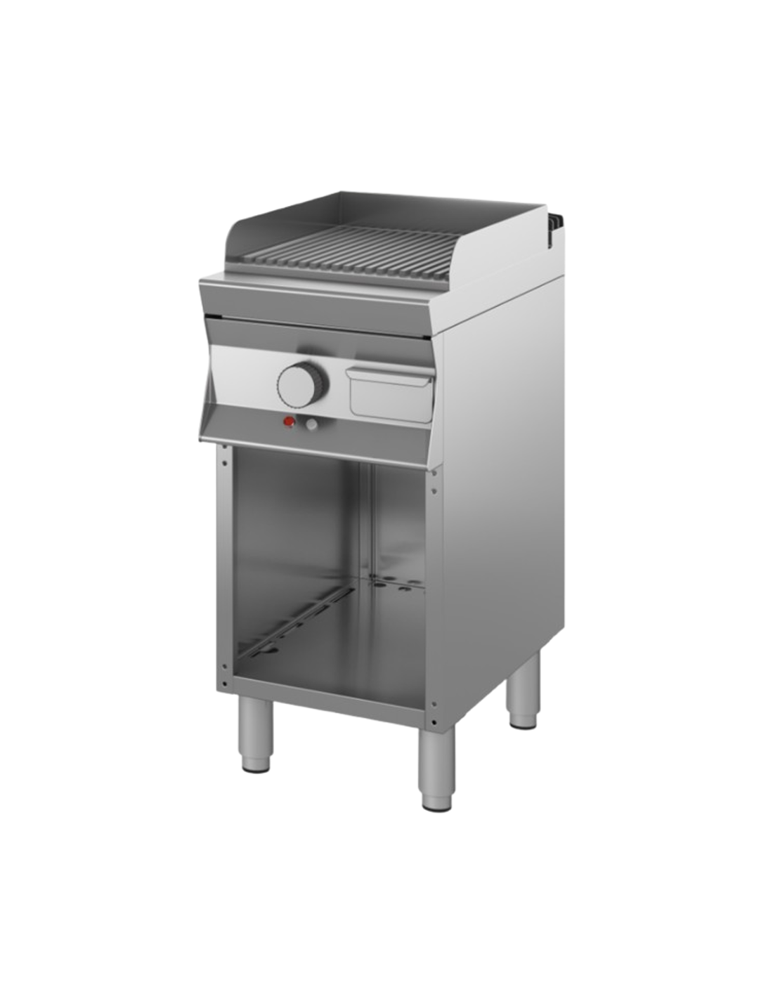 FryTop Eléctrico - Placa Acanalada - Modelo 9CFTE1RA-CR - Compartimento abierto - Placa cromada 4.0 - Energía kw 7.5 - Peso kg 77 - Dimensiones cm 40 x 90 h