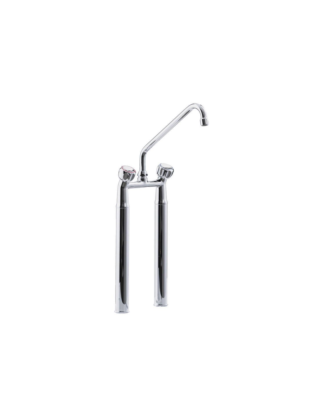 Grifo de dos orificios con prolongaciones, caño giratorio, con manetas redondas. Longitud del caño: 25 cm