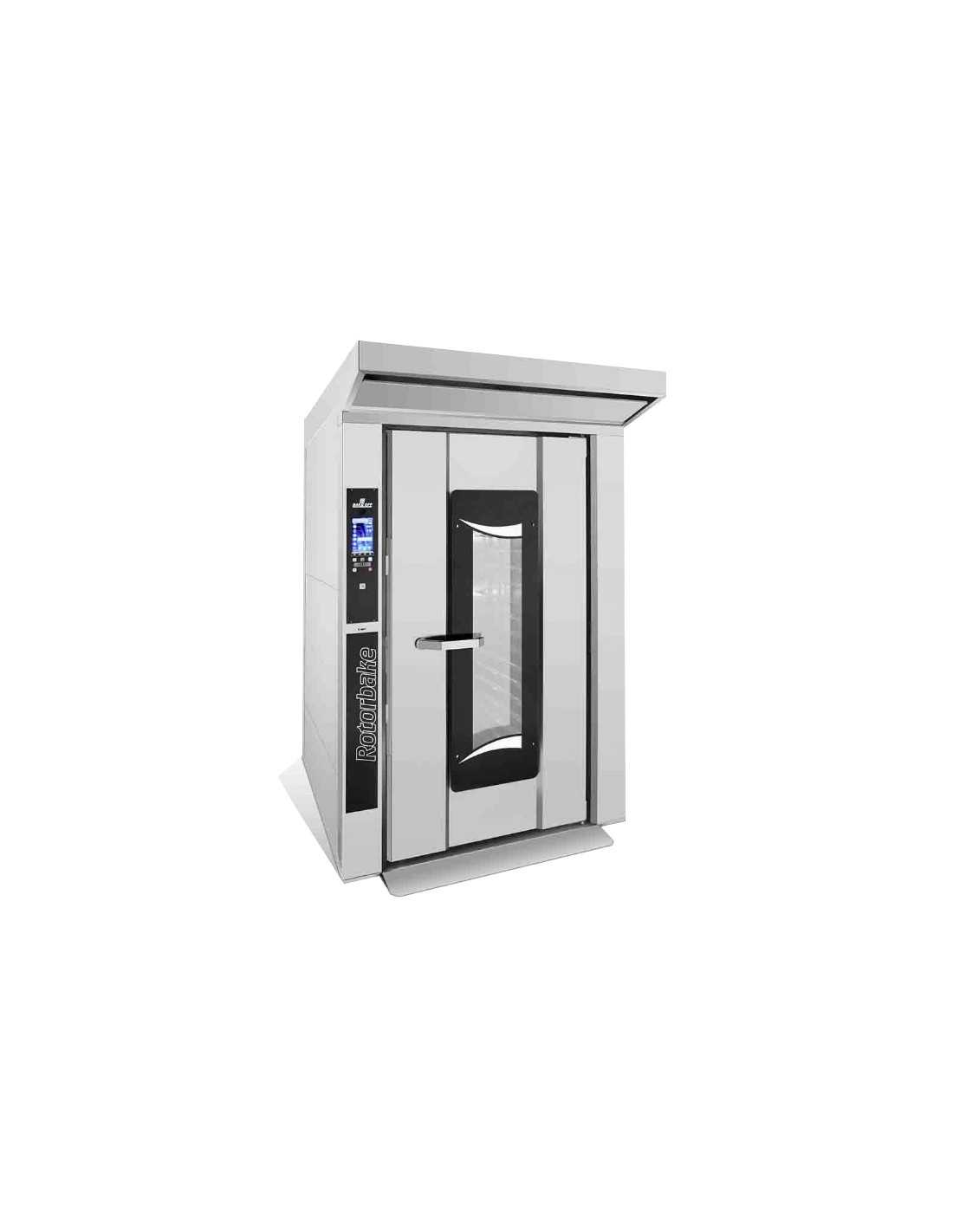 | Horno rotativo para pan y bollería para masas frescas, congeladas o precocidas, compacto y versátil gracias al intercambiador de calor original y altamente fiable en "U" garantizado por 10 años que reduce las dimensiones totales y el consumo optimizando la combustión, de alta tecnología con gestión del clima en la cámara, ciclos de cocción programables hasta 10 fases y regulación de la velocidad del ventilador. |