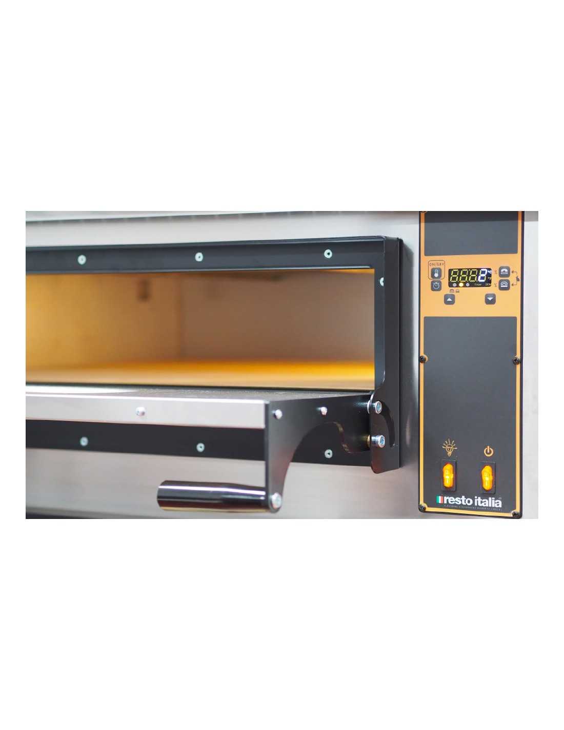 Horno eléctrico - Para pizza -Temperatura 50/450°C - Número de bandejas 2 (60X40cm) - Capacidad pizza n° 6 - Diámetro pizza 36 cm - Cámaras de cocción n° 1 - Dimensiones cámara cm 108 x 72 x 14 h - Panel de control digital - Dimensiones cm 132 x 86.5 x 40 h