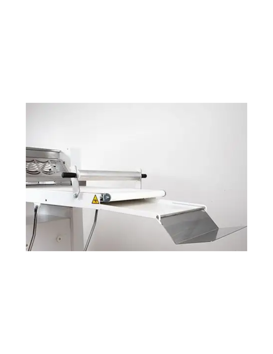 | Mediante el movimiento de la cinta transportadora, la masa se enrollará en el rodillo (suministrado) para ser transportada al banco de trabajo para su posterior procesamiento | |