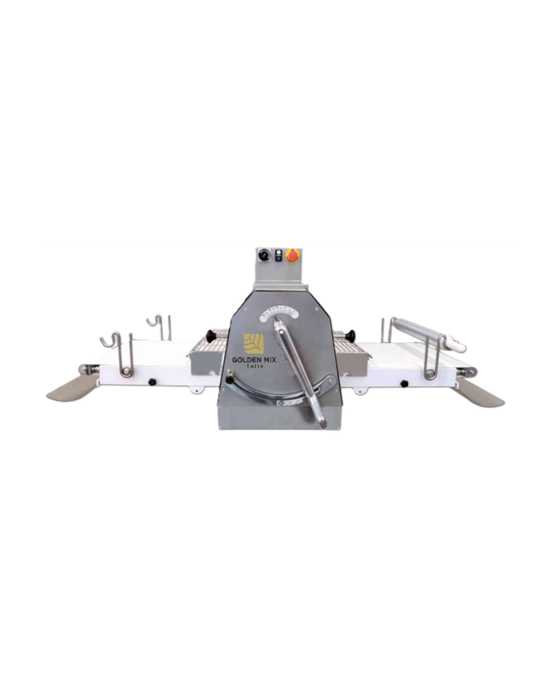 | Las palancas situadas a ambos lados de la máquina actúan sobre el movimiento de las cintas transportadoras, que llevarán la masa hacia los cilindros, estos últimos esparcirán I'masa y la soltarán en la cinta opuesta | |
