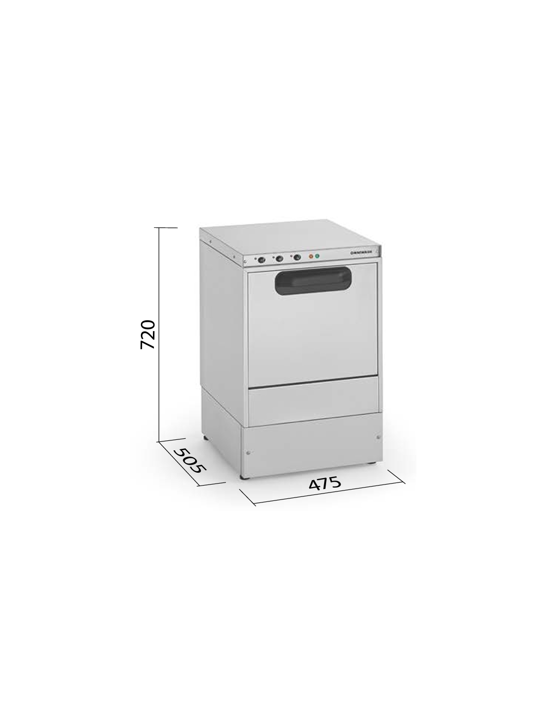 Lavavasos - Modelo: E40 - Altura máxima de paso cm 29 - con bomba de desagüe - con dosificador de abrillantador mecánico - Capacidad depósito 14 lt - Cesta cuadrada cm 35 x 35 - Dimensiones cm 47,5 x 50,5 x 72 h