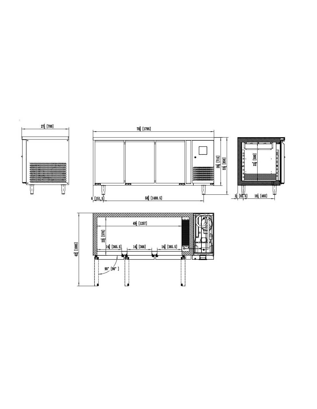 Mesa refrigerada - Sin suelo - N. 3 puertas - cm 187 x 70 x 80/87 h