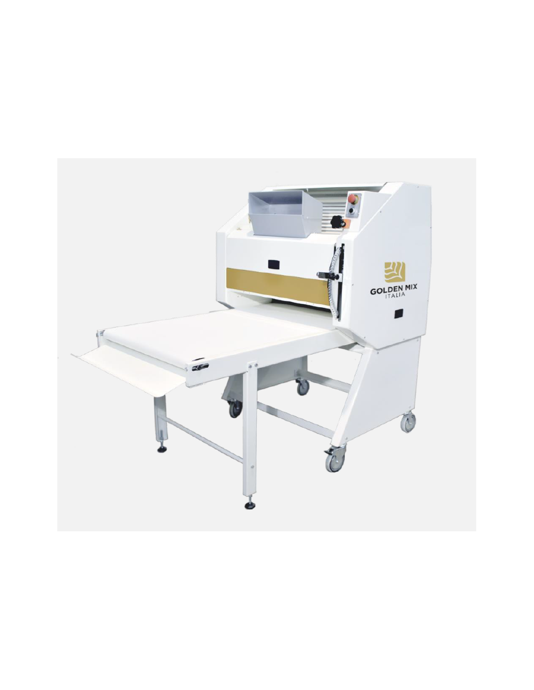 Hace rodar la masa a través de 3 cilindros prensadores de nylon alimentario que se ajustan a la posición óptima según las necesidades mediante la acción de una palanca que se desliza sobre un sector graduado. Una vez encontrada la posición adecuada, los cilindros trabajan la masa aplastándola, reduciendo su espesor y dirigiendo el producto hacia una cinta que lo enrolla y le permite entrar entre 2 alfombras opuestas, afinándolo suave y progresivamente. Estas dos "alfombras de prensado" se regulan mediante un mando con indicador milimétrico | |