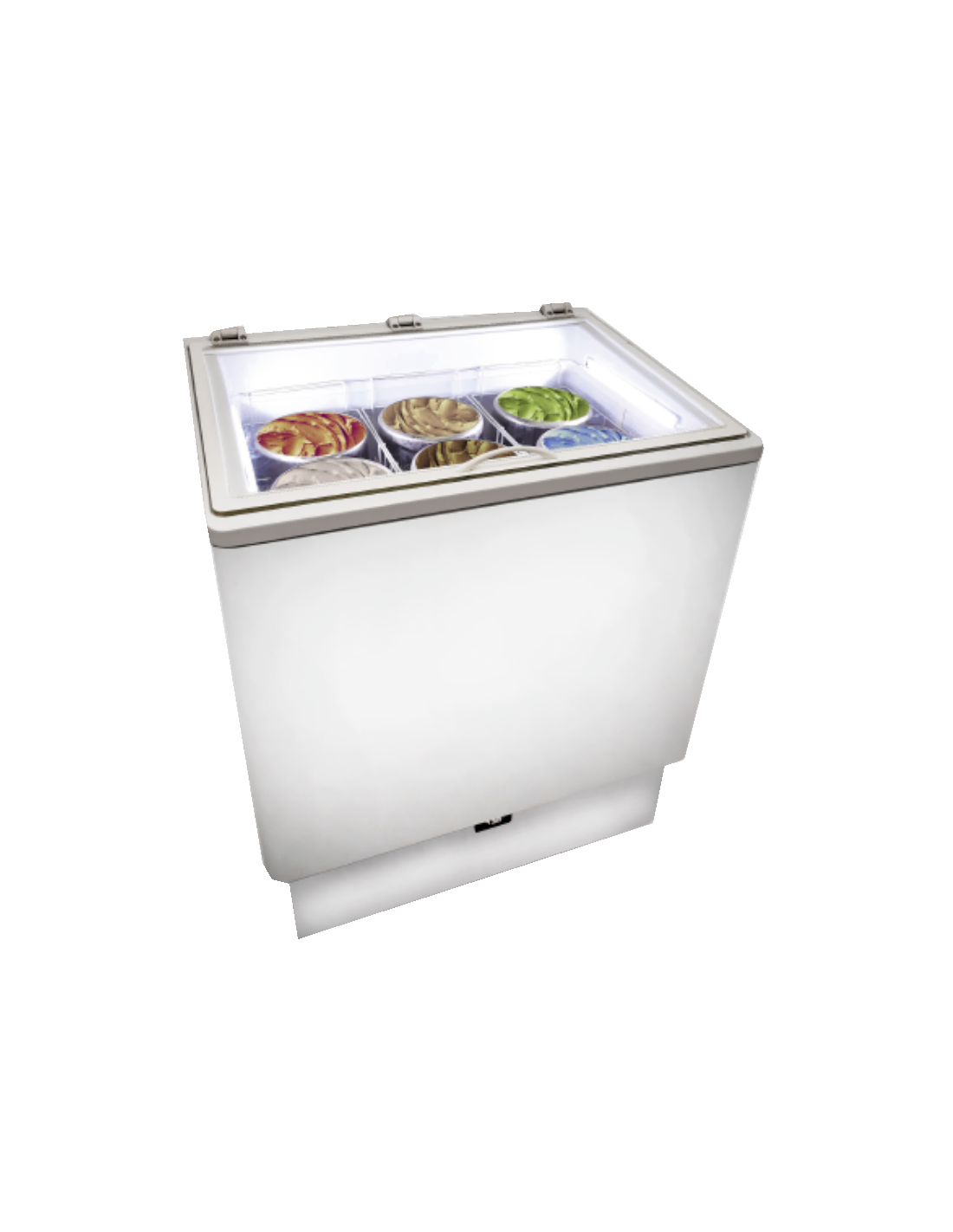 Vitrina de helados - Modelo JOY - Temperatura -10 - 22°C - Estática - Dimensiones cm 85 x 62,7 x 101 h - Cestas antigiro para recipientes de 6 x 8 litros.