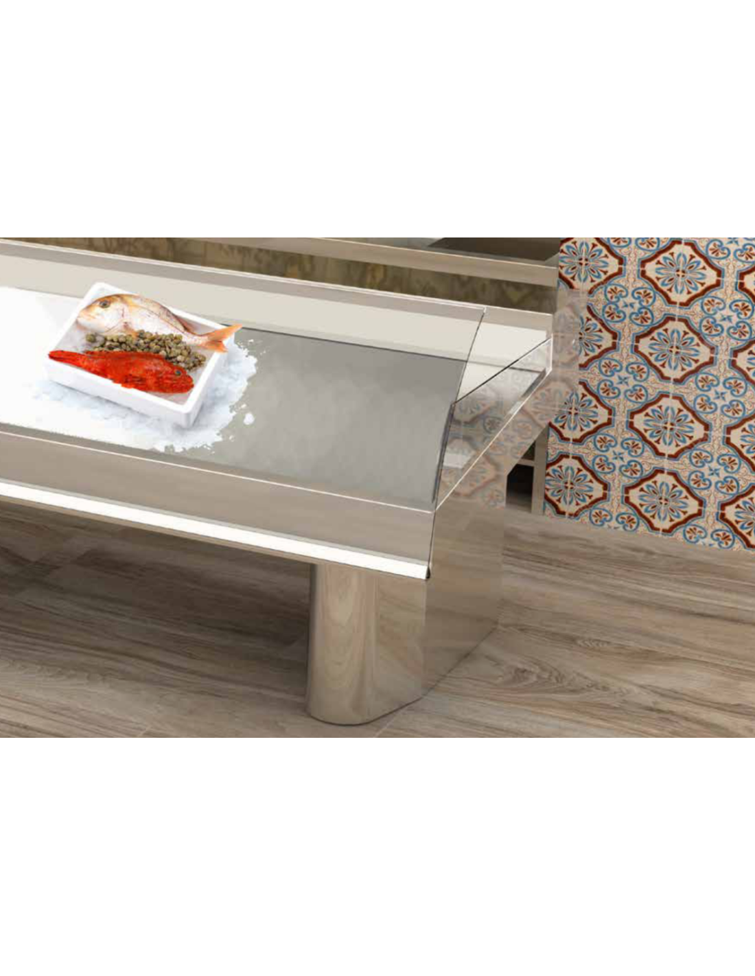 cm Mostrador refrigerado para exposición y venta de pescado - Modelo CORVC1 - Cristal curvado - Unidad de refrigeración no incluida - Estructura de acero inoxidable AISI 316 - Refrigeración mediante evaporador estático de placas - Temperatura -1°/ 4° C - Encimera de acero inoxidable cm 25 - Canalizable - Profundidad de estante de exposición cm 90,9 - Dimensiones 93,8 x 116,8 x 90 h