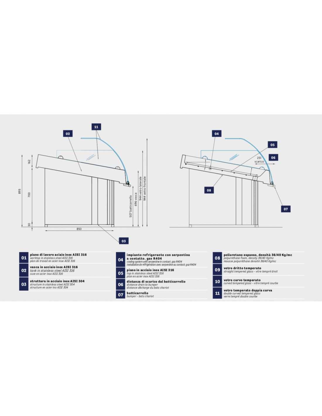Mostrador refrigerado para exposición y venta de pescado - Modelo PERVDC2 - Cristal curvado con mostrador - Unidad de refrigeración no incluida - Estructura de acero inoxidable AISI 316 - Refrigeración mediante evaporador estático de placas - Temperatura -1°/ 4° C - Puede canalizarse - Profundidad de la superficie de exposición cm 90,9 - Dimensiones cm 125 x 116,8 x 90 h
