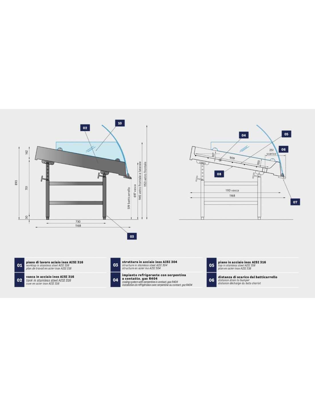Mostrador refrigerado para exposición y venta de pescado - Modelo CRIVC5 - Cristal curvado - Grupo frigorífico no incluido - Estructura de acero inoxidable AISI 316 - Refrigeración mediante evaporador estático de placas - Temperatura -1°/ 4° C - Canalizable - Profundidad de la superficie de exposición cm 90,9 - Dimensiones cm 218,8 x 116,8 x 90h