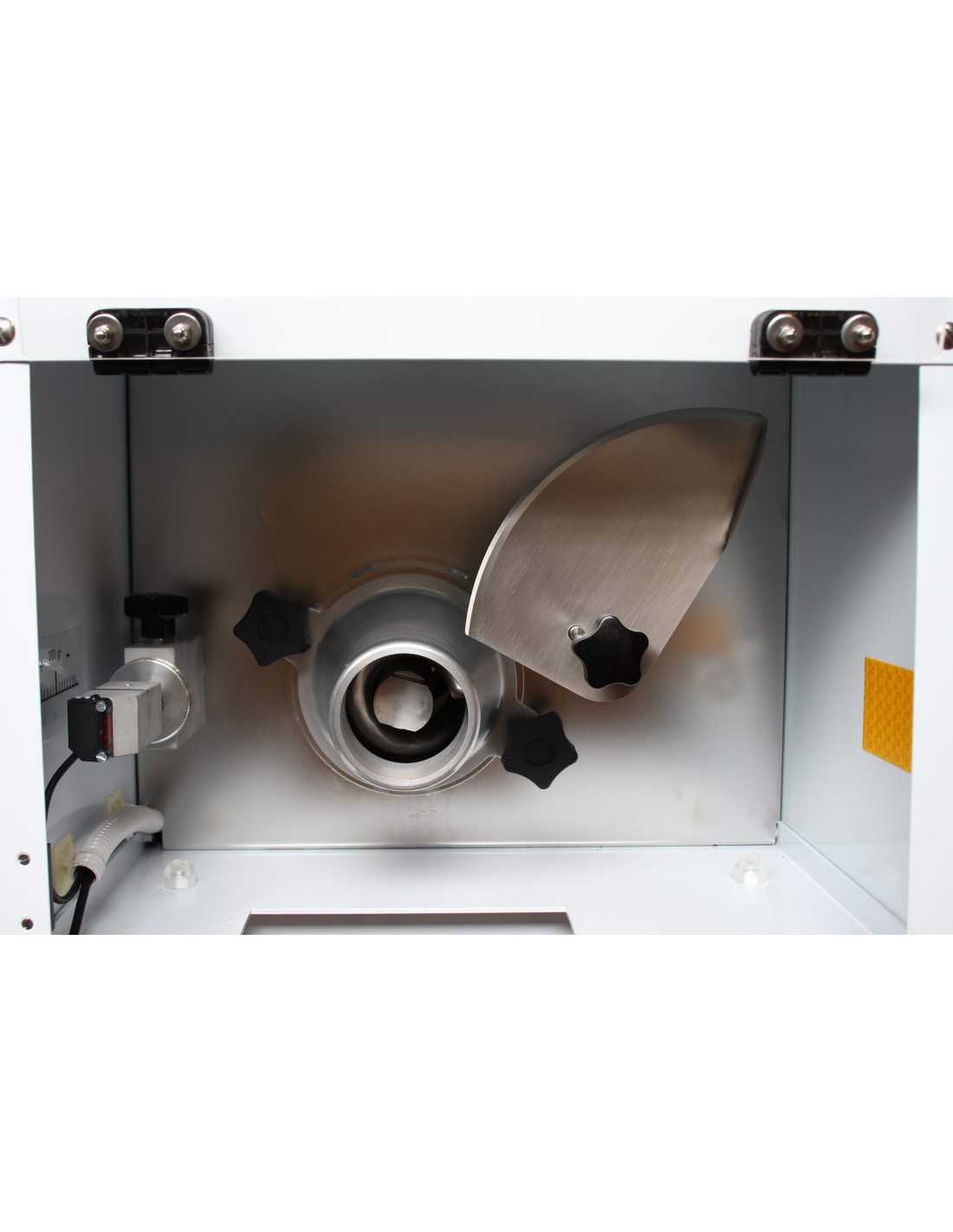 | El peso de la porción se selecciona mediante una fotocélula que mide la distancia desde la salida de la masa del cono hasta la cuchilla de corte; con el ajuste milimétrico de la distancia se pueden obtener todas las medidas con los dos conos (diámetro 45 y 70 suministrados). | |