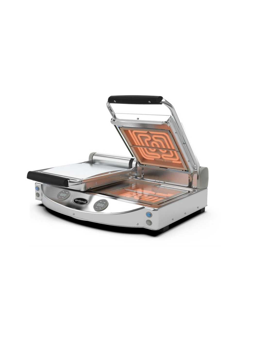 | Sistema profesional de cocción por contacto con placas vitrocerámicas, adecuado para cocinar una amplia gama de alimentos diferentes como: tostadas, sándwiches, carne, pescado, verduras, huevos, etc. | |