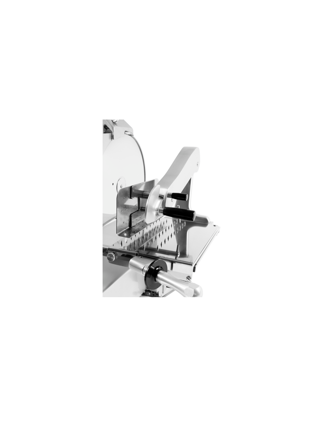 | Il rivoluzionario meccanismo brevettato di spostamento carrello/blocco salume permette una perfetta tenuta del prodotto durante il taglio, reso ottimale dalla lama per volano. | |