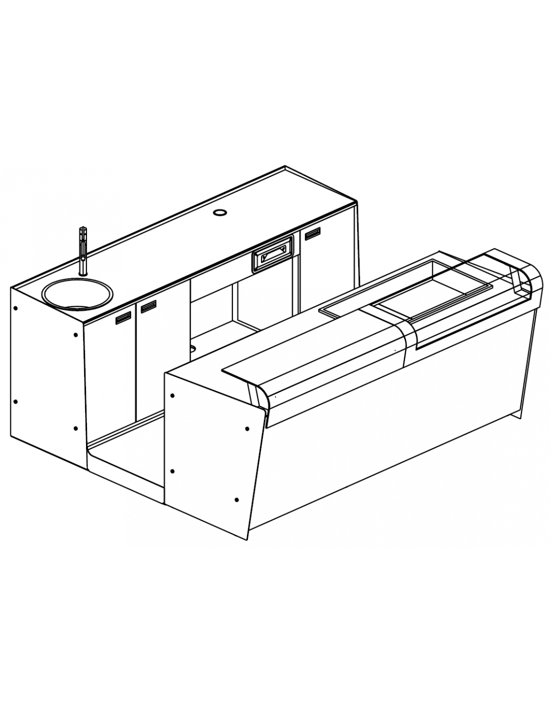 Banco bar e retrobanco - Con bancalina in vetro trasparente - Con vasca refrigerata con vetro di protezione vasca - N. 3 celle refrigerate - Postazione per macchina caffè - Lavello ø 42 cm e miscelatore - Refrigerazione ventilata - Motore a bordo - Alimentazione monofase V230/1/50Hz - Dimensioni Cm L 250 x P 232,5 x h 115