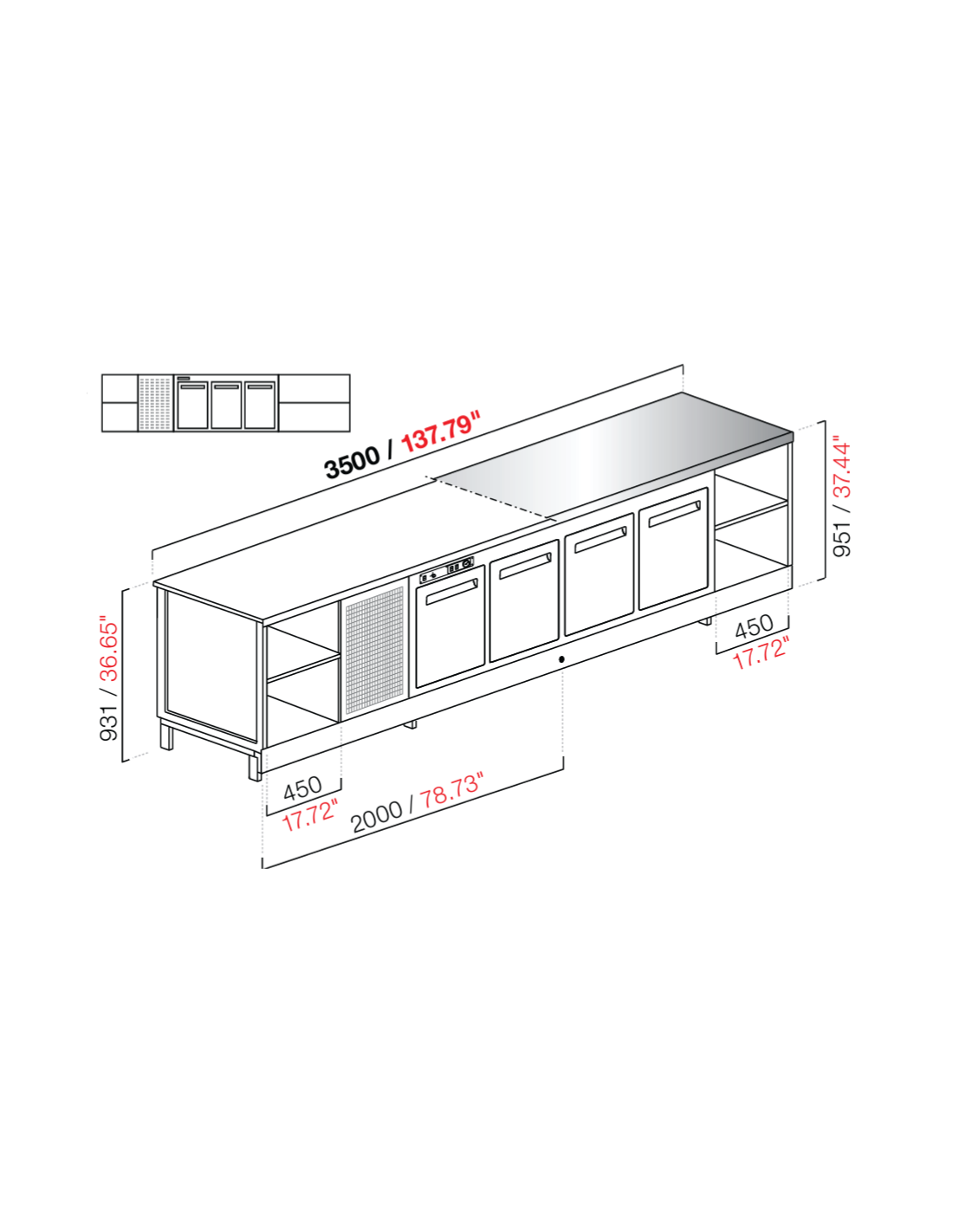 Banco bar - Lineare - Refrigerato - N.3 porte + 3 vani - cm 350 x 68.8 x 113.1 h