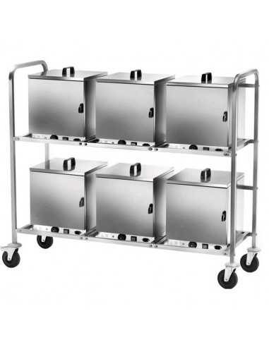 Carrello porta cassetta termica - Modello CPC600 - Per cassette termiche CTS300 - Con allacciamento elettrico - Struttura tubolare 25x25cm in acciaio inox - Guide per contenere 6 cassette termiche - Ruote di cui 2 con freno - Cassette non incluse - Alimentazione monofase 230V/50-60Hz - Dimensioni cm 155 x 61 x 132h