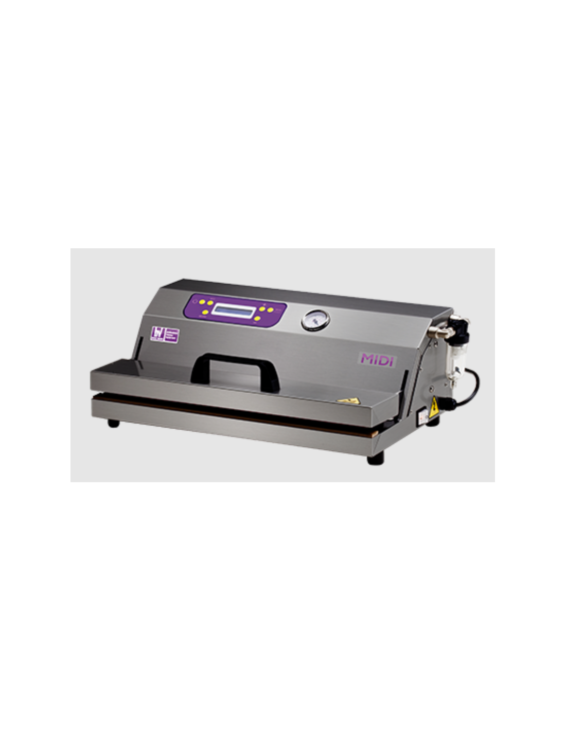 Confezionatrice sottovuoto semiautomatica - Mod. MIDI - Barra saldante mm (x2)430 - Pannello digitale - Pompa del vuoto 20 l/min - Struttura in acciaio inox - Dimensioni cm 51.5 x 29 x 18 h