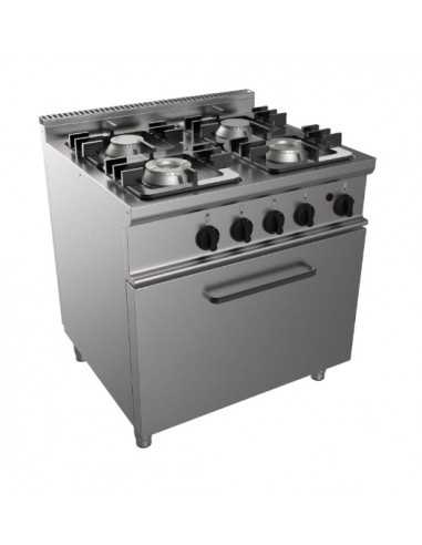 Cucina a gas - Modello E7CUPG4FO2M2G - N. 4 fuochi - Bruciatori kW 7.5 x 2 - kW 4.5 x 2 - Forno a gas statico cm 54.5 x 53 x 35 h - - Struttura in acciaio inox - Potenza kW 31.9 - Dimensioni cm 70 x 70 x 85 h