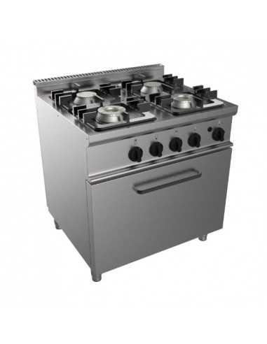 Cucina a gas - Modello E7KUPG4LO4M - N. 4 fuochi - Bruciatori kW 4.5 x 4 - Forno a gas statico GN 2/1 cm 68.5 x 53 x 35 h - - Struttura in acciaio inox - Potenza kW 25.9 - Dimensioni cm 80 x 70 x 85 h