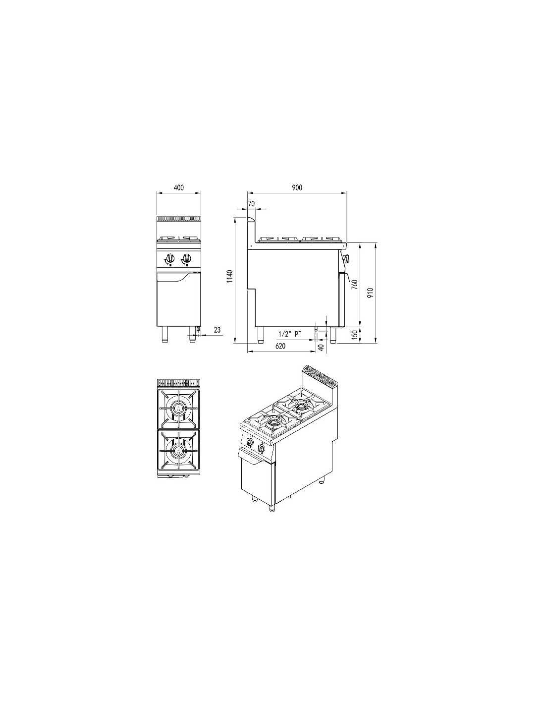 Cucina a gas - Mod. AT0G5B-F3 - 2 Fuochi - Alimentazione a gas - Potenza totale a metano kW 24 - Struttura in acciaio inox - Dimensioni cm 40 x 90 x 114h