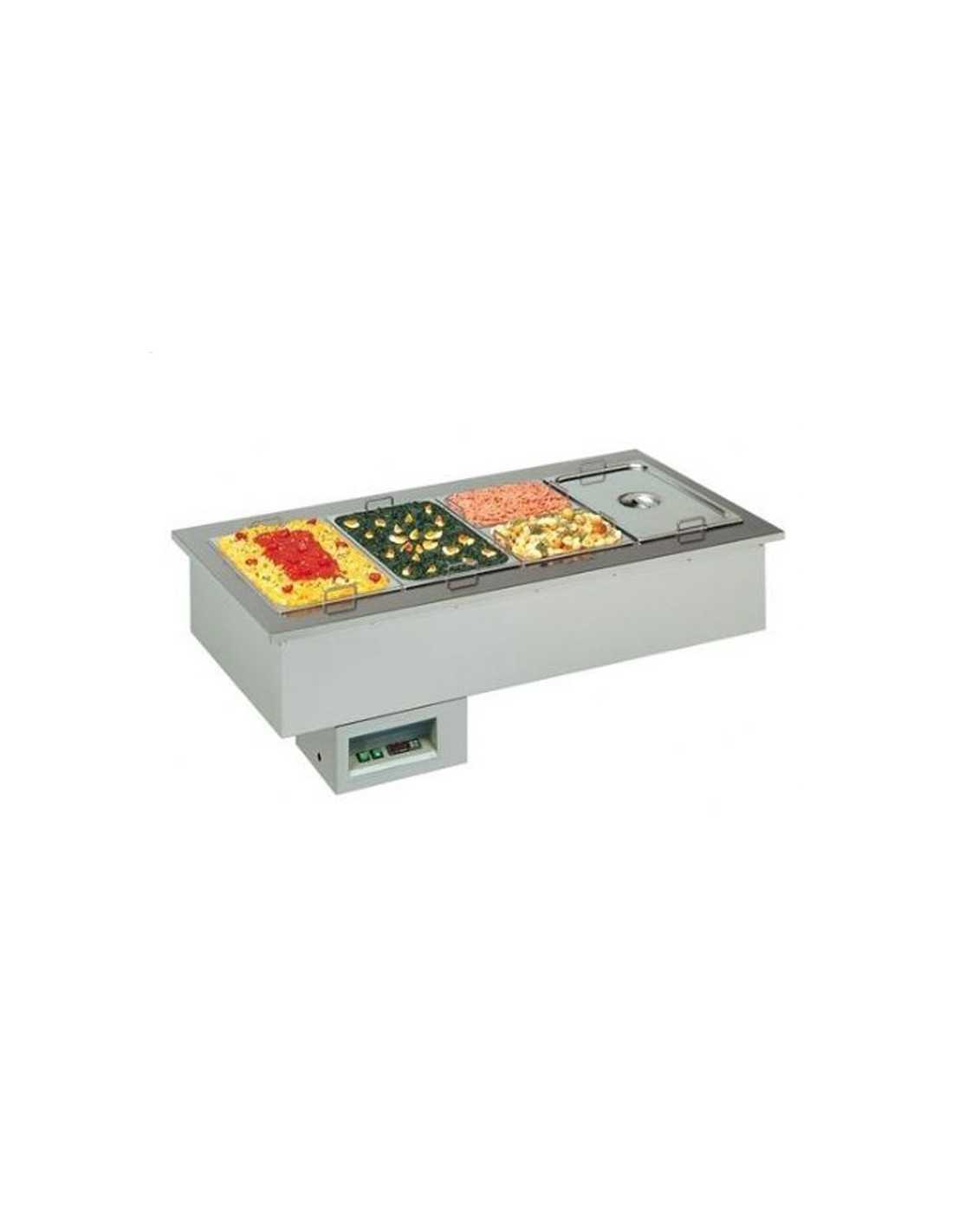 Vasca espositiva da incasso riscaldata bagnomaria - Per gastronomia -Temperatura +30°/+90°C - Bacinelle compatibili GN 1/4 - 1/3 - 1/2 - 2/3 - 1/1 - 2/1 - Solo bacinelle da cm 15 di altezza - Potenza W 3050 - Alimentazione monofase V 230/1/50Hz - Dimensioni cm 177.2 x 75 x 41.2 h -Peso kg 48