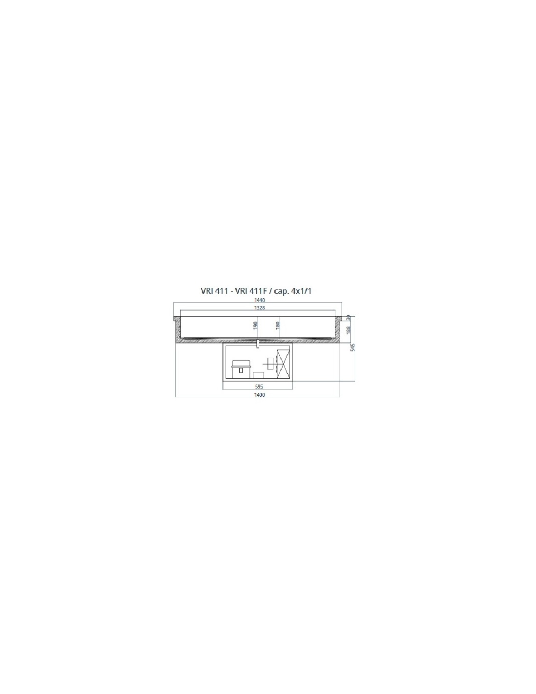 Vasca refrigerata - Modello VRI411F - Acciaio inox AISI 304 - Da incasso - Temperatura -5/+5 °C - Spessore isolamento 50 mm - Refrigerazione statica - Gruppo incorporato nel vano inferiore - Controllo temperatura elettronico con termostato digitale - Sbrinamento automatico - Evaporazione dell'acqua di condensa automatica - Potenza W 340 - Alimentazione monofase 220/240V-50Hz - N°4 x GN1/1 cm 15h - Dimensioni cm 144 x 68 x 54.5 h