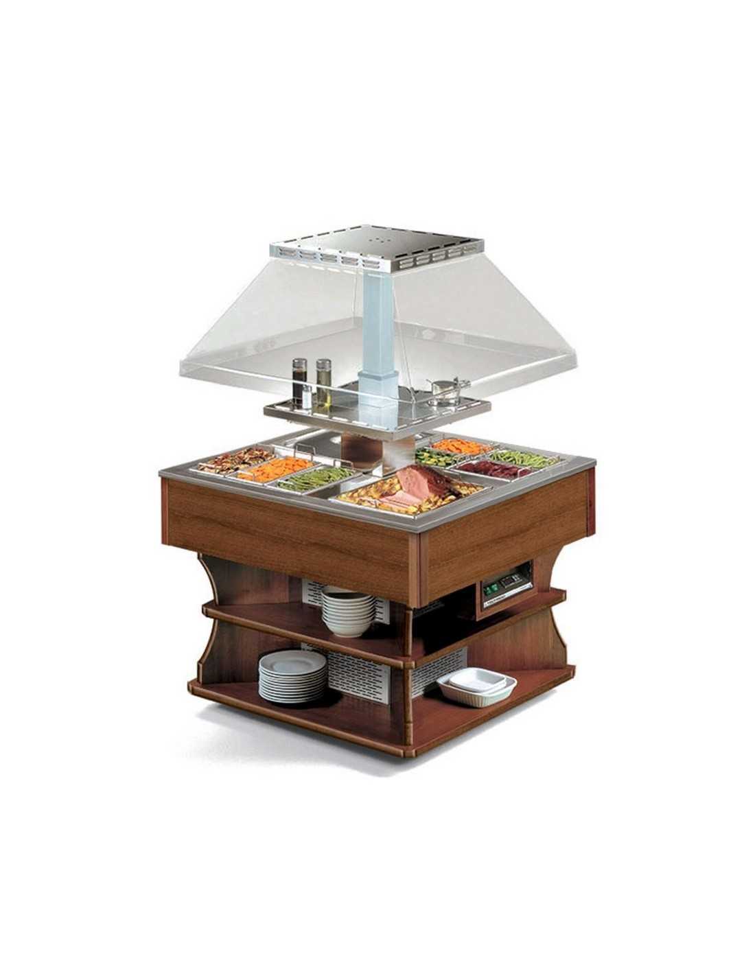 Isola buffet espositiva riscaldata bagnomaria - Mod. OASI4BM - Temperatura +30°/+90°C - Struttura in legno - Vasca in acciaio inox - Potenza totale w3400 - Alimentazione trifase V400/3/50Hz - Dimensioni cm 107.5 x 107.5 x 171h