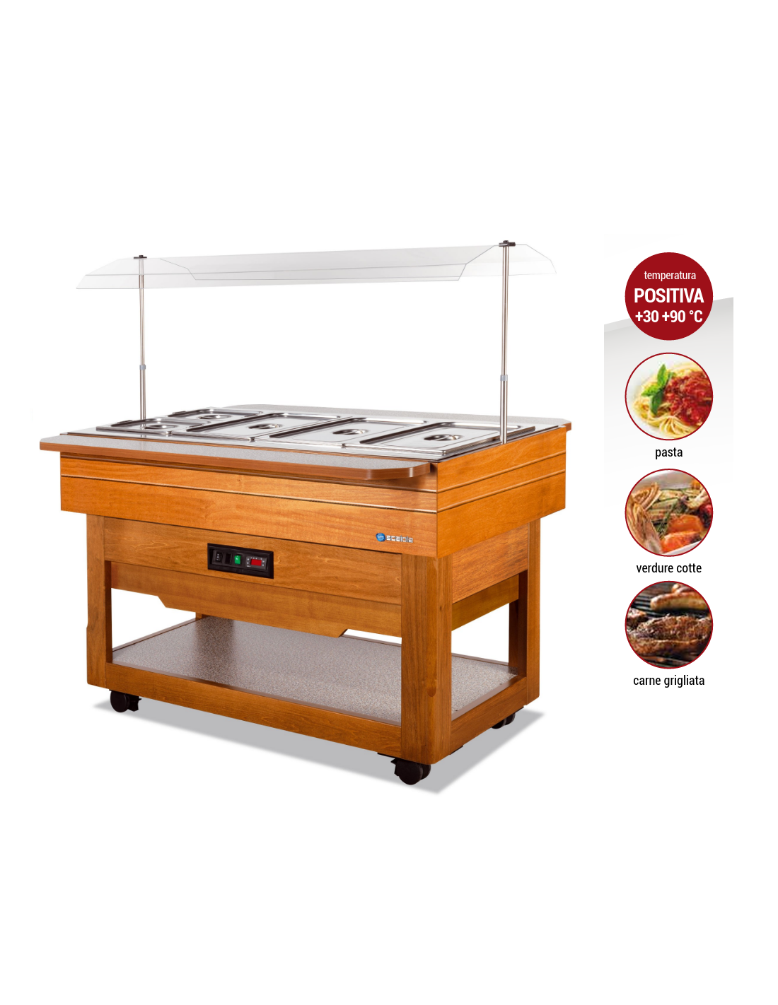Espositore buffet caldo in legno con copertura fissa - Temperatura +30 / +90°C - cm 140 x 107 x 145 h