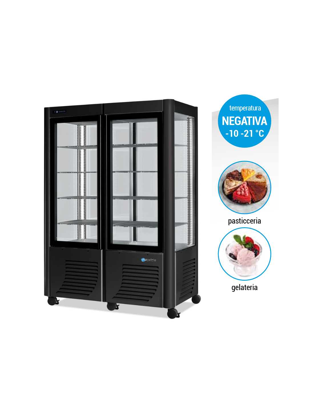 Vetrina per Pasticceria e Gelateria - Temperatura -5 / -20 °C - Capacità Litri 800 - Esposizione su 4 lati - Refrigerazione statica - Illuminazione LED - Dimensioni cm 127 x 70 x 184 h