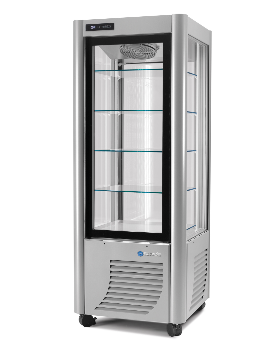 Vetrina refrigerata per pasticceria e gelateria - Temperatura +5 / -21 °C - Capacità Litri 400 - Esposizione su 4 lati - Refrigerazione ventilata - Illuminazione LED - Dimensioni cm 70 x 70 x 184 h