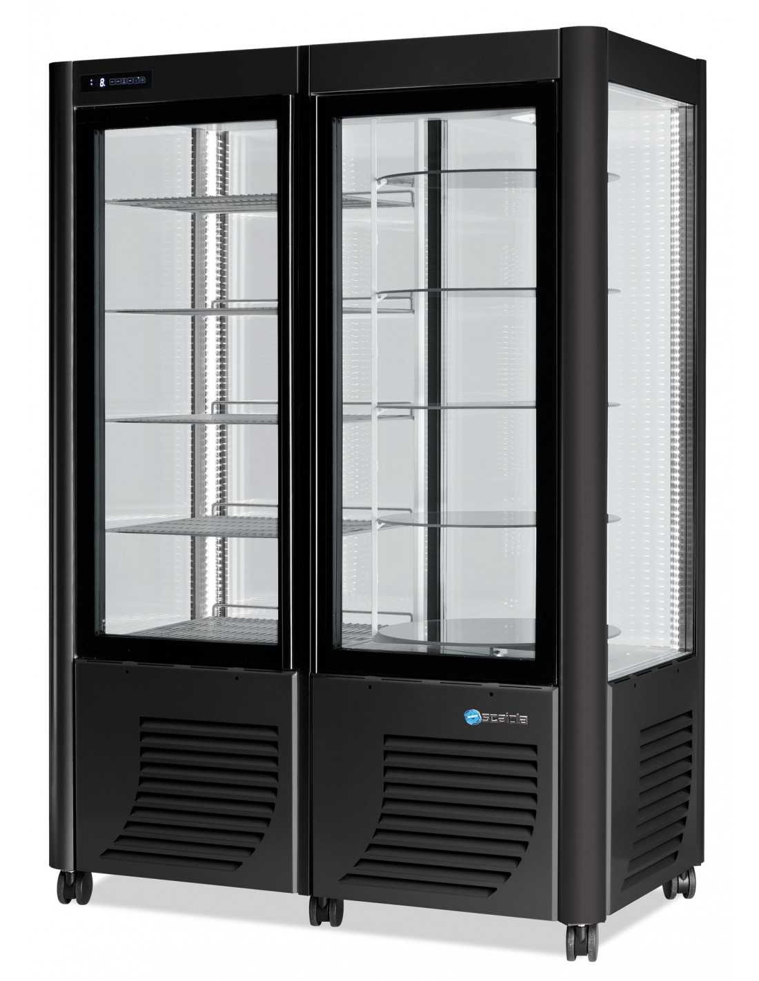 Vetrina refrigerata - Temperatura +2 / +10 °C - Capacità Litri 800 - Esposizione su 4 lati - Ripiani rettangolari un lato e circolari l'altro - Refrigerazione ventilata - Illuminazione LED - Dimensioni cm 127 x 70 x 184 h