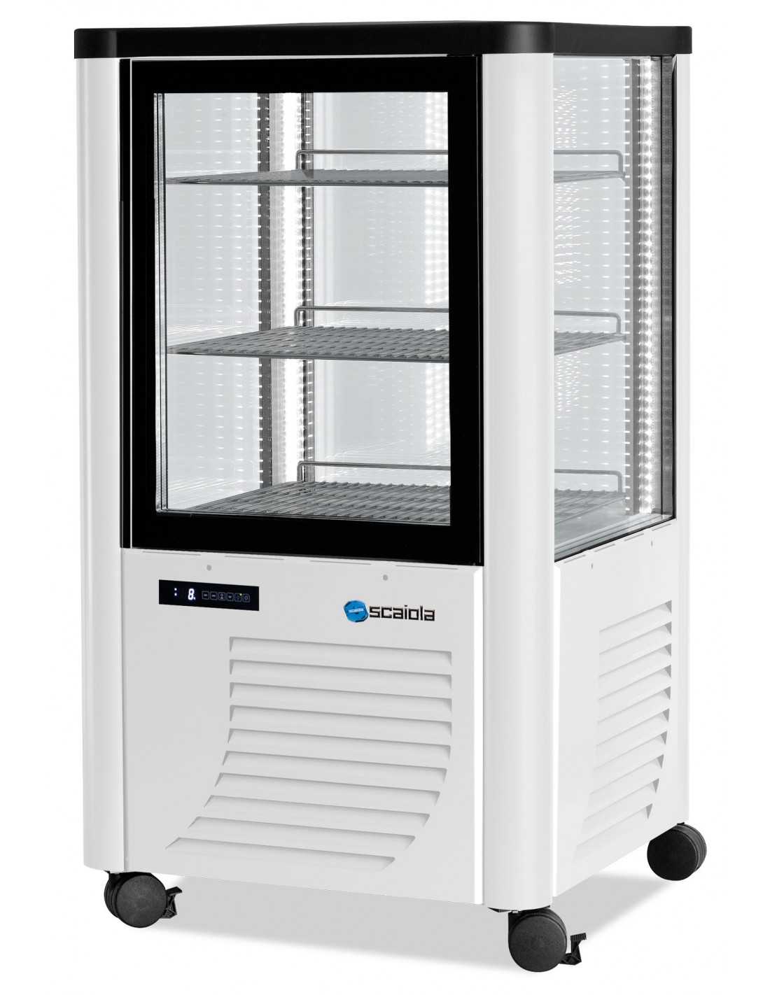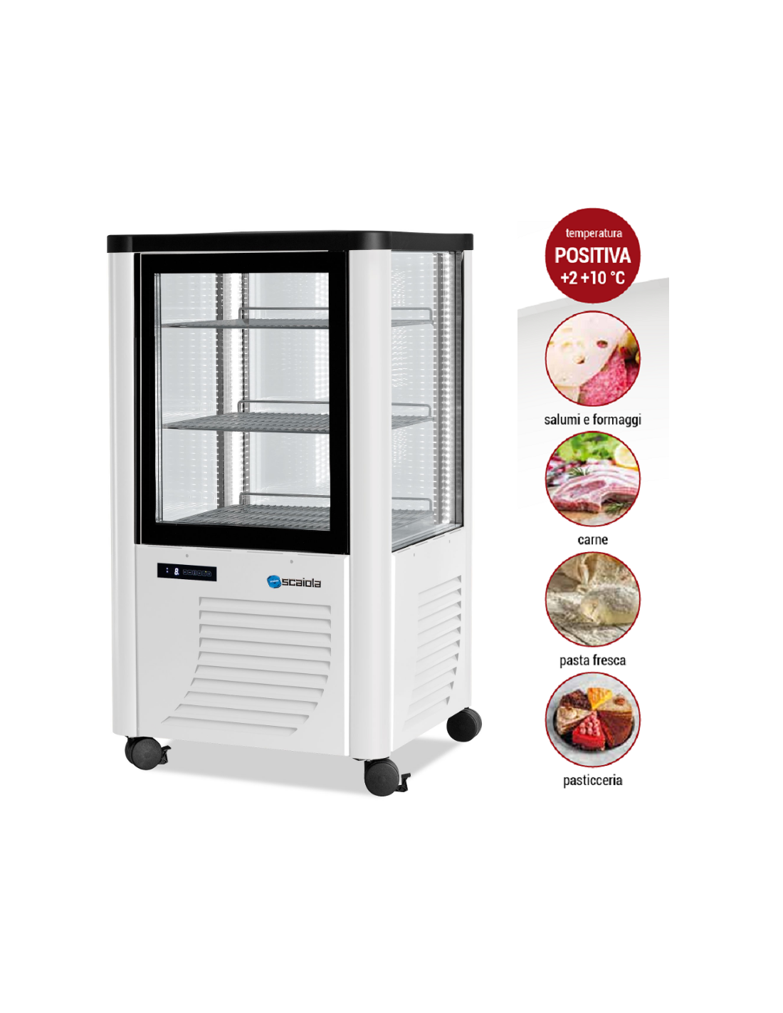 Vetrina refrigerata - Temperatura +2 / +10°C - Capacità Litri 230 - Esposizione su 4 lati - Ripiani rettangolari - Refrigerazione ventilata - Illuminazione LED - Dimensioni cm 70 x 70 x 128 h