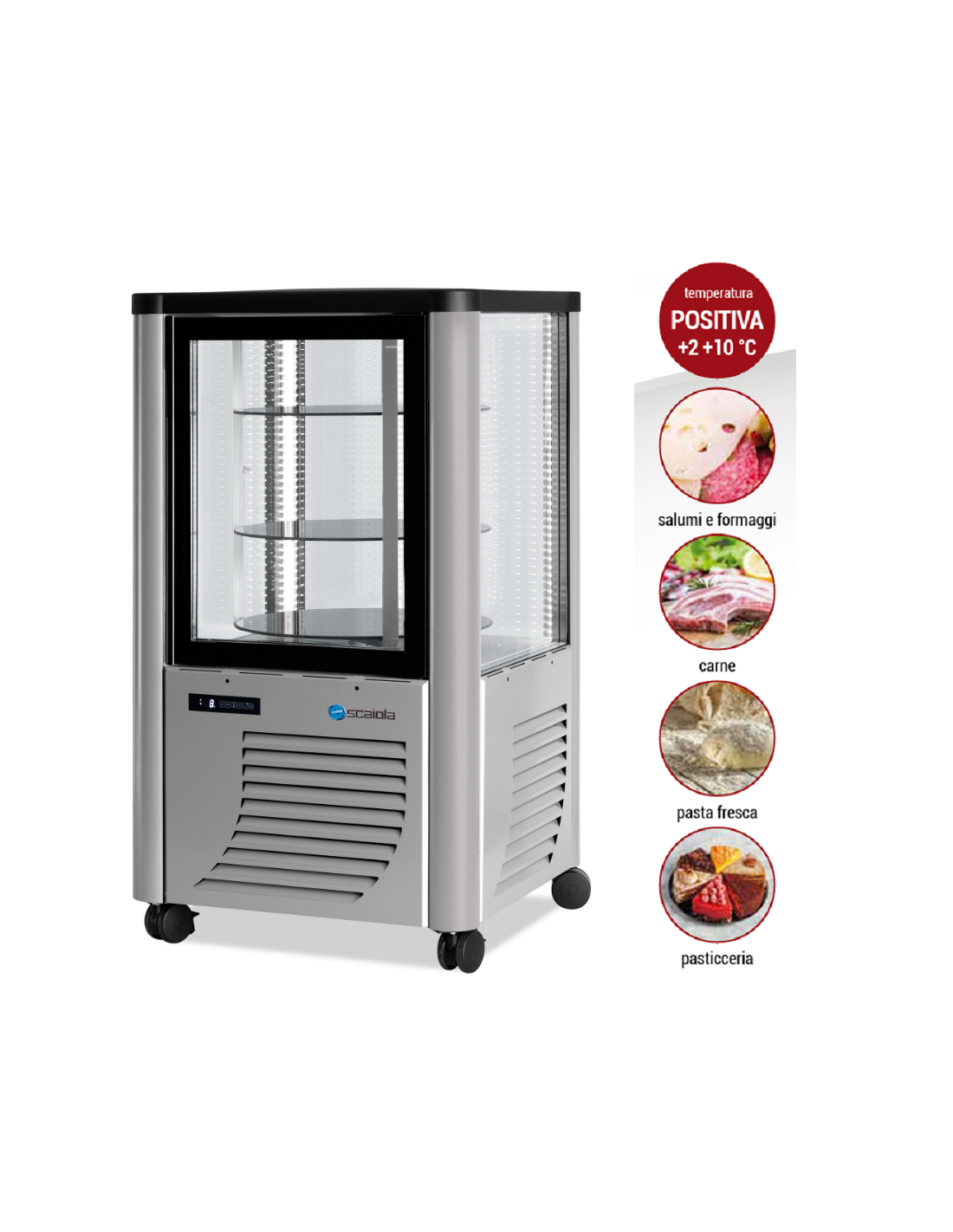 Vetrina refrigerata - Temperatura +2 / +10°C - Capacità Litri 230 - Esposizione su 4 lati - Ripiani circolari - Refrigerazione ventilata - Illuminazione LED - Dimensioni cm 70 x 70 x 128 h
