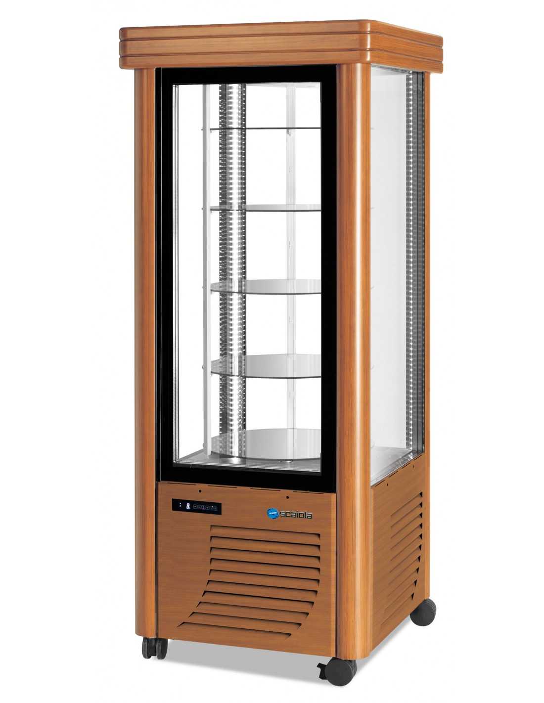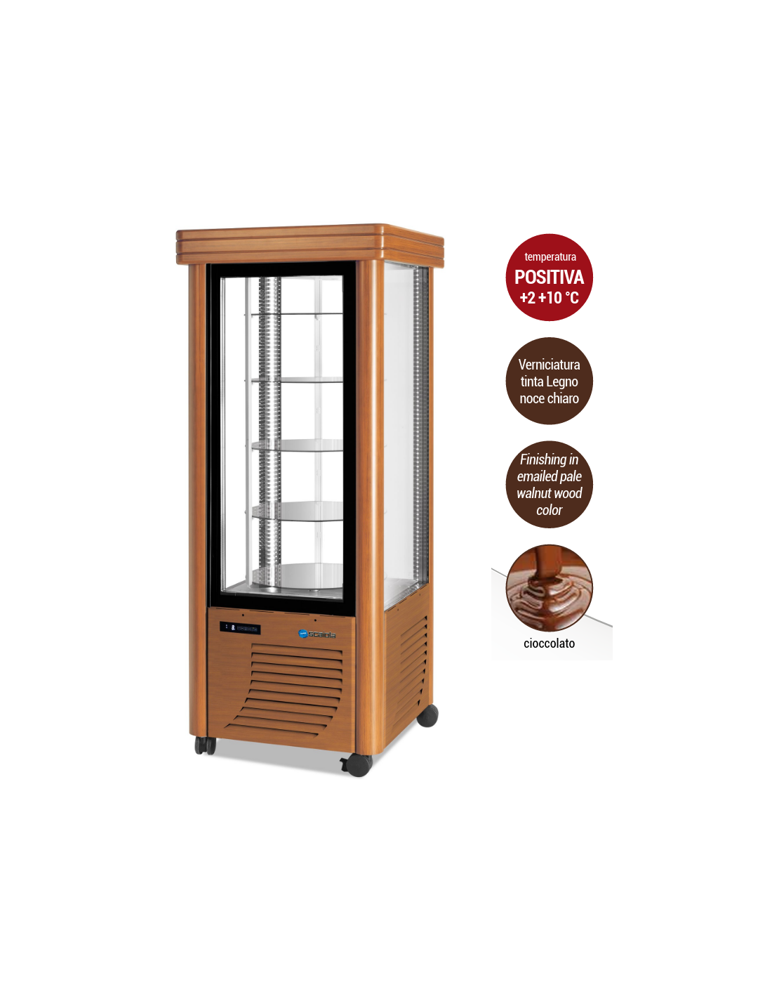 Vetrina per cioccolato - Temperatura +14/+18 °C - Capacità Litri 400 - Ripiani circolari - Esposizione su 4 lati - Refrigerazione ventilata - Sbrinamento Automatico - Illuminazione LED - Dimensioni cm 75 x 75 x 186 h