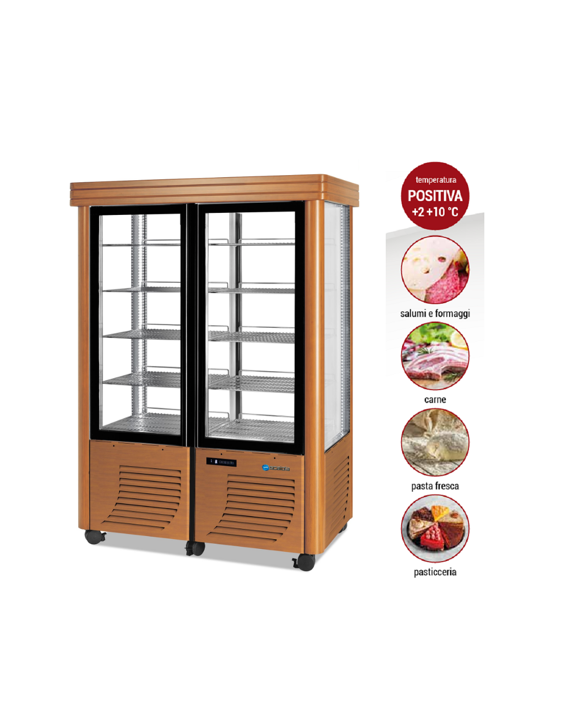Vetrina refrigerata - Temperatura +2 / +10 °C - Capacità Litri 800 - Esposizione su 4 lati - Ripiani rettangolari - Refrigerazione ventilata - Sbrinamento Automatico - Illuminazione LED - Dimensioni cm 132 x 75 x 186 h