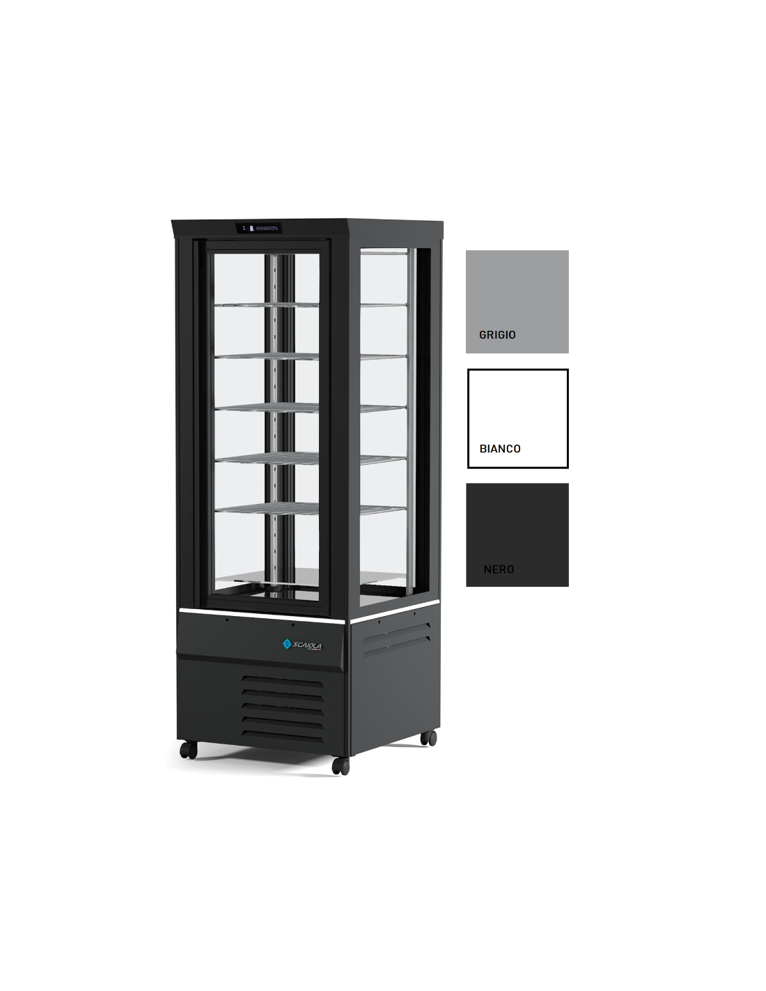 Vetrina pasticceria e gelateria con quattro lati vetro - Temperatura +2 +10 °C - Refrigerazione Ventilata - Capacità litri 420 - N°5 Ripiani - Illuminazione LED - Dimensioni cm 69 x 72 x 187 h