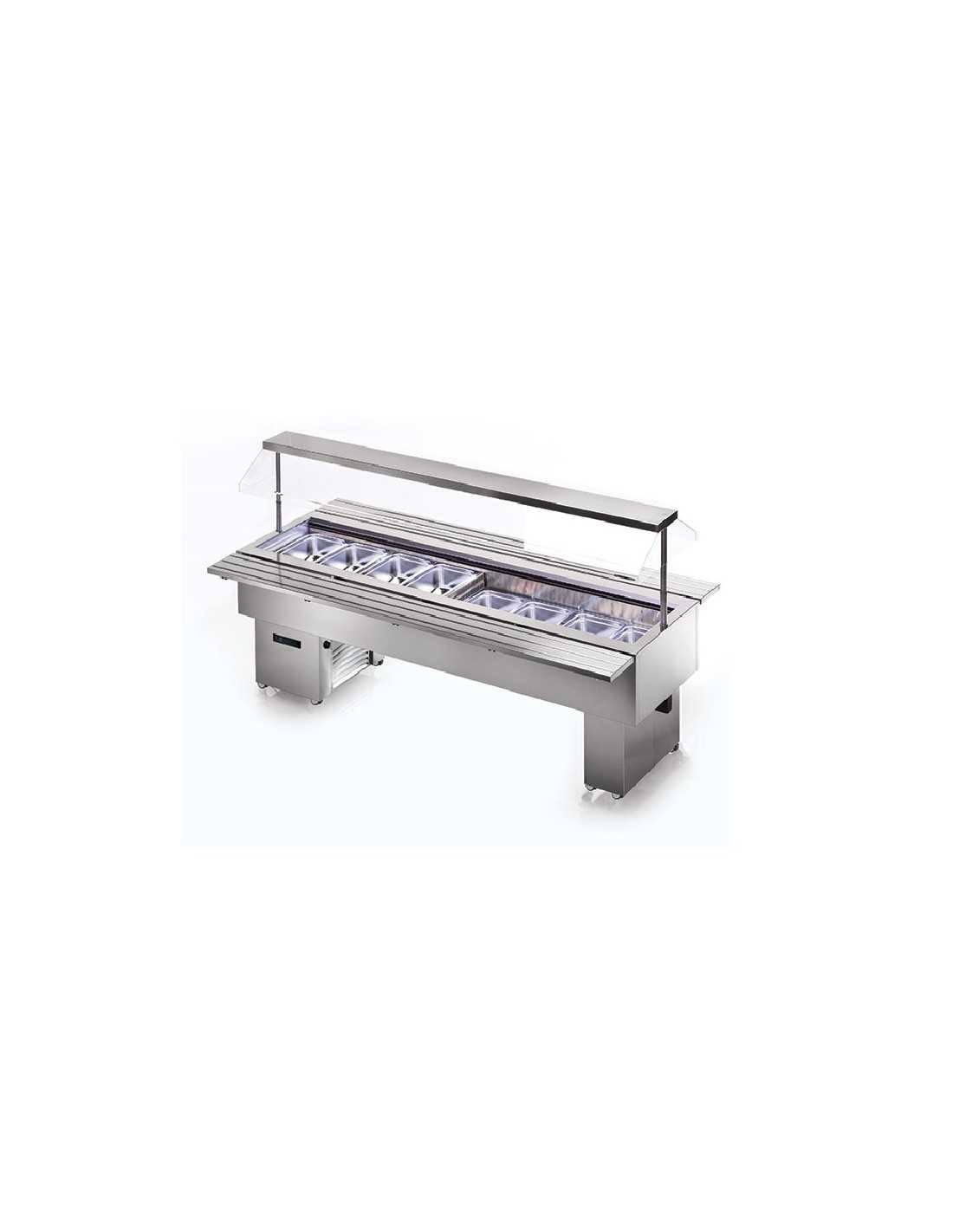 Isola buffet espositiva refrigerata - Mod.ISOLA 6.0 M VT INOX - Temperatura +4°/+10°C - Refrigerazione Ventilata - Vasca e struttura esterna in acciaio inox AISI 304 - Sbrinamento automatico - Alimentazione monofase - potenza W 500 - Dimensioni cm 218,5 x 75 x 150h