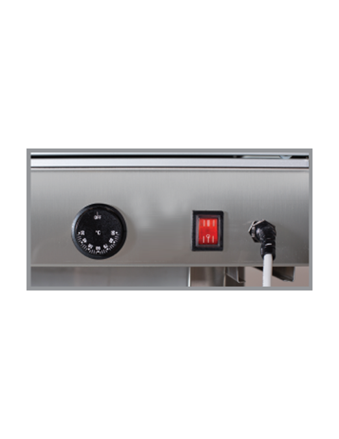 | La vetrina calda presenta un piano appoggio con feritoia e foro con vaschetta umidificatrice con carico manuale per favorire la fuoriuscita del calore |