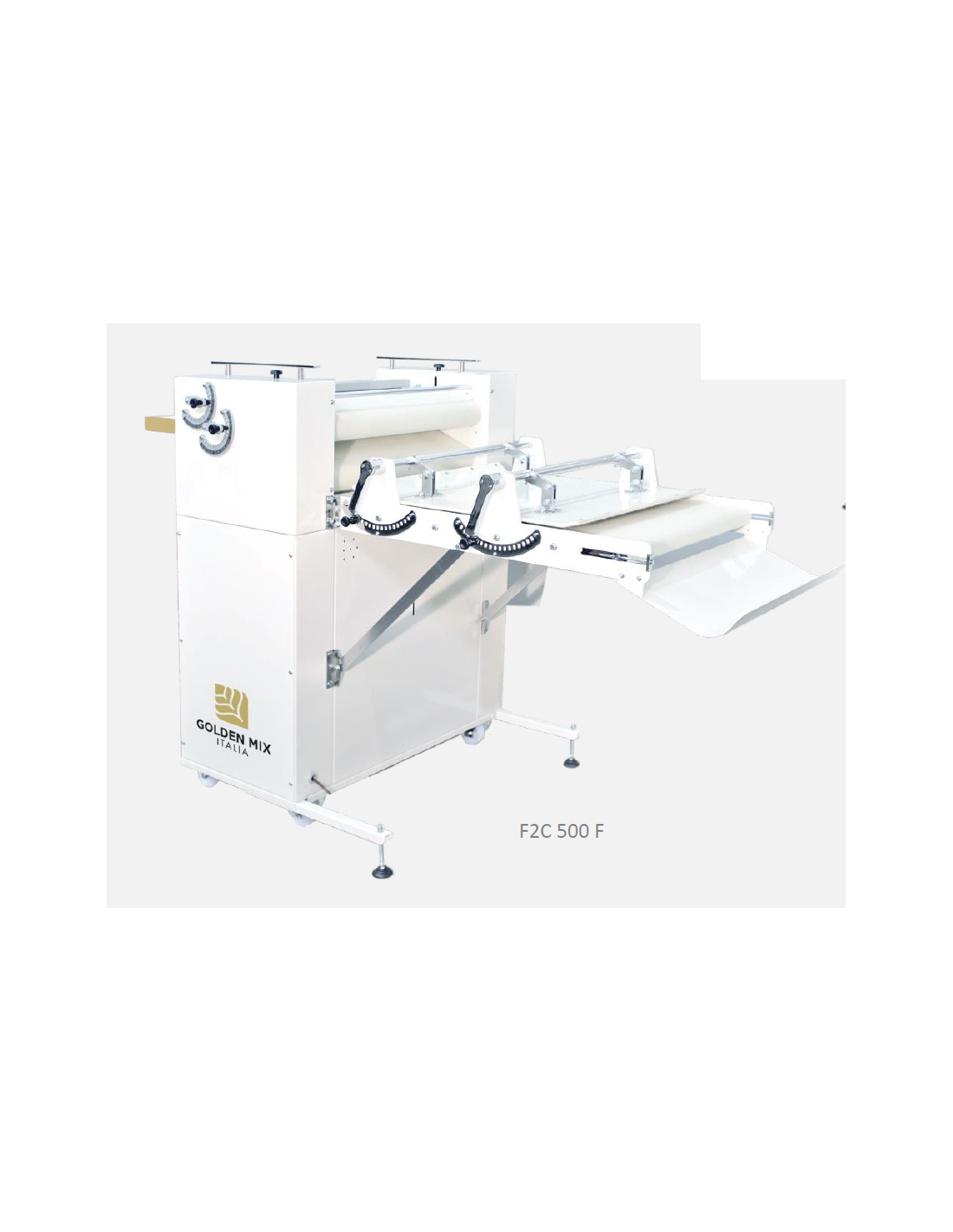 Formatrice a 2 cilindri - Mod. F2C500EASY-FIL - Cilindri mm 500 - Grammi pasta 30÷2500 - Con filonatore - Con spalle interne verniciate - Con raschiatore - Potenza Kw 0.75 - Alimentazione trifase V400 / 3 / 50Hz - Dimensioni cm 187 x 85 x 123 h