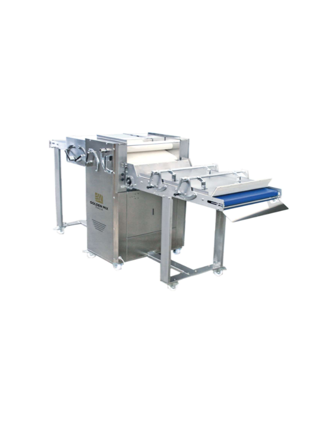 Formatrice a 6 cilindri - Mod. GOLDEN600+FIL - Struttura in Acciaio Inox - Cilindri mm 615 - Con Filonatore Larghezza utile 630 mm - Grammi pasta 15-2500 - n° 2 Cilindri Pressori Motorizzati - n°2 Tappeti Arrotolatori - con Dispositivo Anti-Scarto - Alimentazione trifase - Dimensioni cm 227 x 100 x 136 h