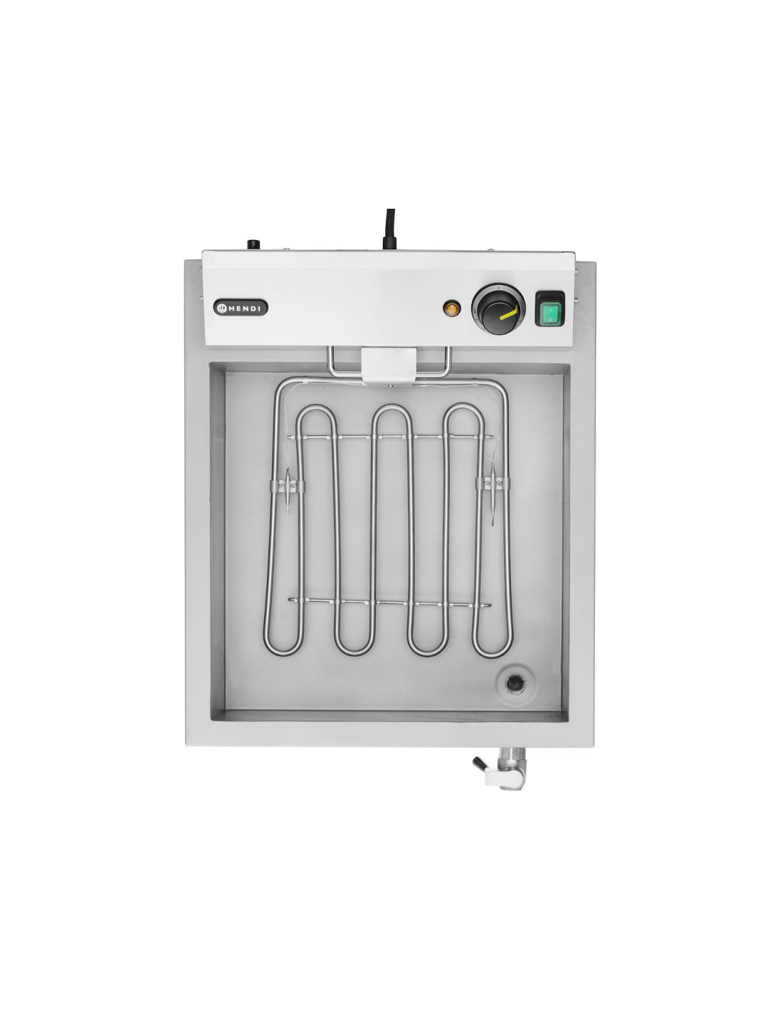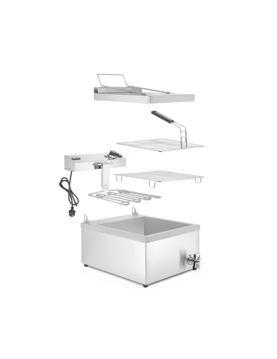| Interamente realizzato in acciaio inossidabile, viene fornito con due griglie di frittura (354x383mm) con zona fredda, una protezione del surriscaldamento e un coperchio che può anche servire da vassoio antigoccia | |