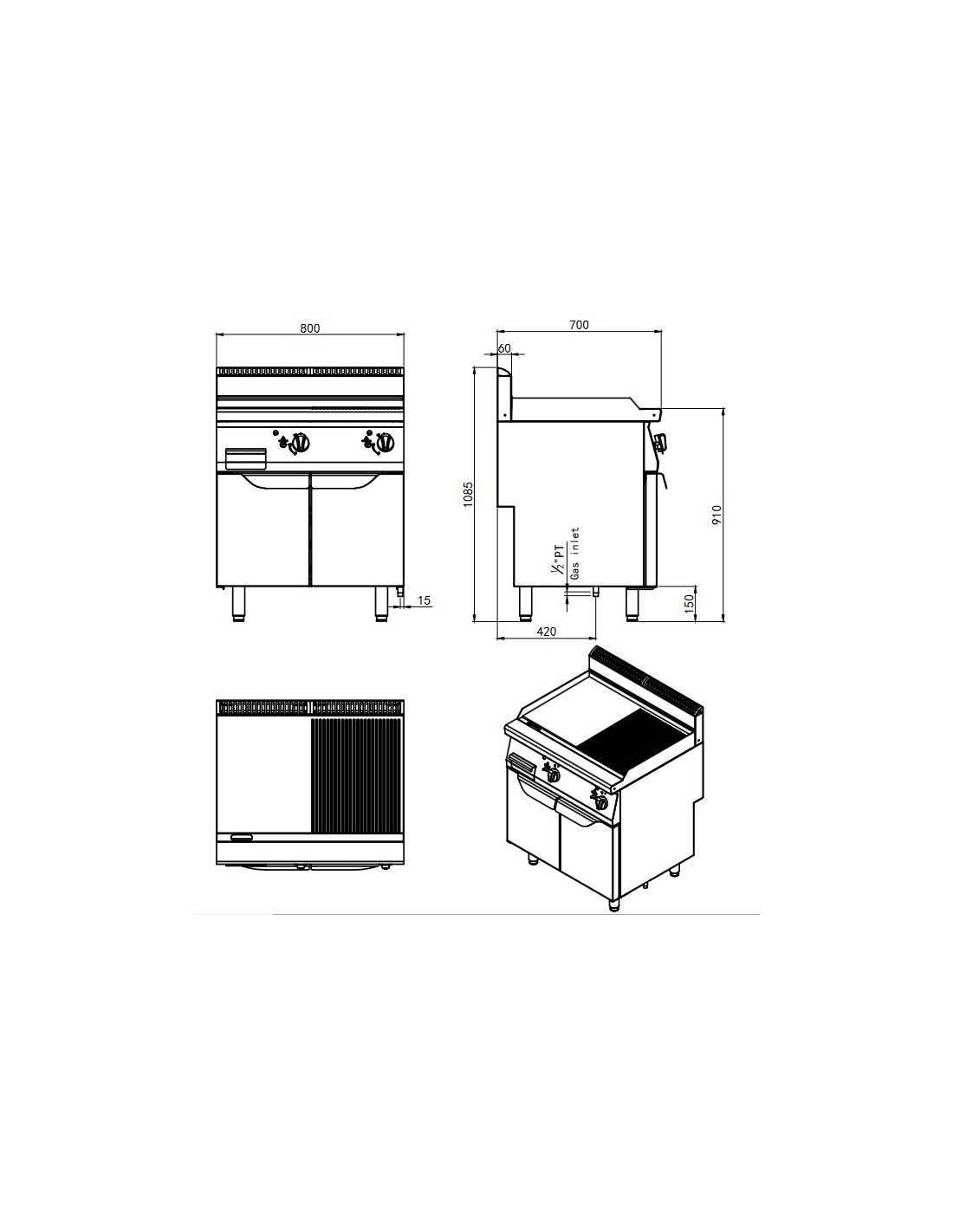 Fry top a gas - Mod. AT8G9GF-D - Piastra 1/2 liscia e 1/2 rigata in acciaio - Dimensioni piastra cm 79.6 x 50.4 - Vano con ante - Potenza kW 2x7 - Alimentazione a gas - Dimensioni cm 80 x 70 x 108.5h