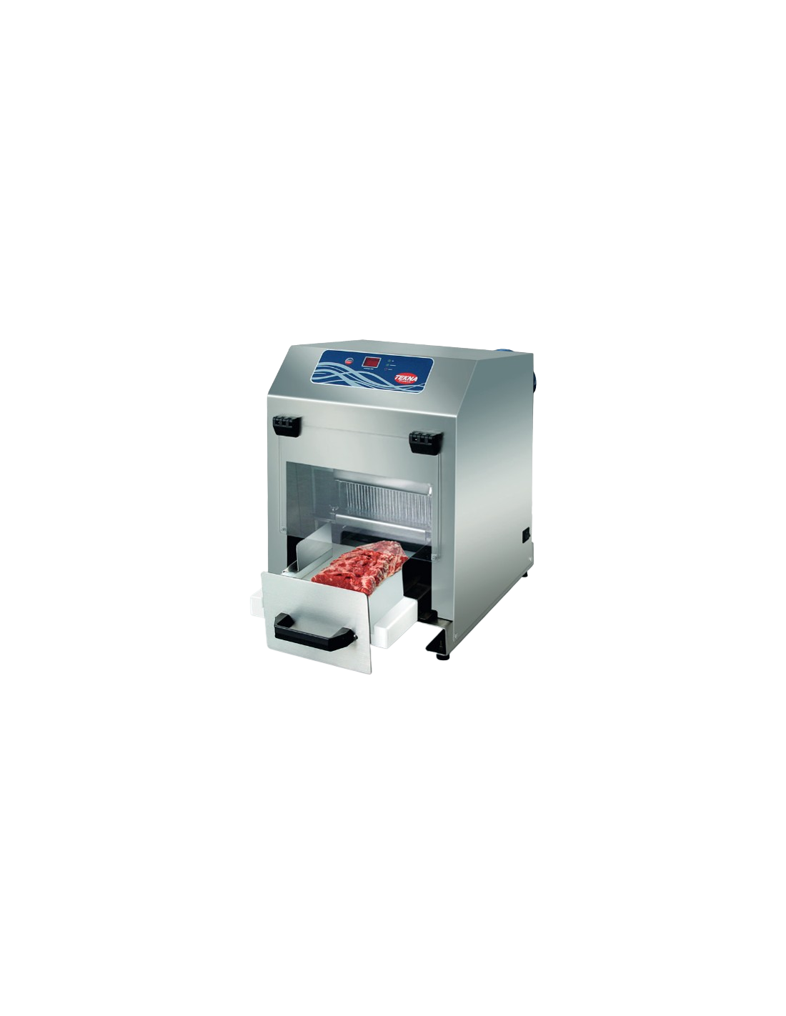 | L'intenerimento della Carne, consiste nel penetrare la carne con un pettine formato da MicroLame in Acciaio Speciale, il Taglio di Carne in Oggetto: Manzo - Vitello - Maiale - Pollo - Cavallo - Tacchino - Pesce ecc ecc creando in questo modo dei microfori che aprono le maglie del tessuto e le fibre muscolari, incidono i Nervi, tendini e cartilagini, così facendo si ottiene un processo immediato di intenerimento, tale da rendere il Prodotto, pronto per essere sottoposto a cottura oppure a confezionamento per lo stoccaggio in Frigorifero | |
