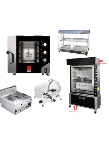 Kit rosticceria composto da: friggitrice a gas + girarrosto verticale a gas + vetrina termica + Forno a gas + Vetrina refrigerata + Affettatrice a gravità lama 350